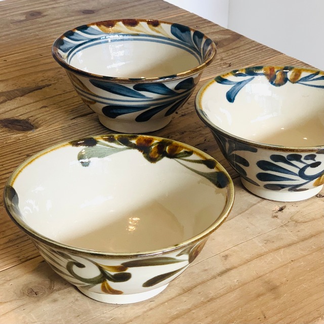 いっちん描きで表現された立体感のある模様に勢いと濃淡が加わり、思わず目を留めてしまう壺屋焼の汁マカイ。 高さがしっかりあり、具材たっぷりの汁物でも満足感たっぷりに盛り付けることができます。 白で描かれるいっちん描きはあまり多くなく、思い切りよく大きく描かれているからこそ、その魅力が十分に現れているように感じます。 ただそこにあるだけで絵になってしまいそうで、食器棚にしまってしまうのは勿体無いと感じる逸品です。 【壺屋焼】 沖縄を代表する焼物の産地・壺屋地区 及び 読谷村周辺にて、およそ400年の長きに渡って作られてきた焼物です。沖縄の焼物は琉球の方言で「やちむん」と呼ばれます。沖縄のおおらかな大地や太陽のエネルギーがそのまま宿ったような器たち。安価な海外品が市場を出回る中、釉薬作りなどは昔ながらの方法で作り、壺屋焼の伝統を守り、人から人へ伝え続けている魅力的なやちむんをお届けします。 カラー:- サイズ: 約Φ12.5 ×H7cm 容量 :- 素材 : 陶器 生産国 : 日本 (沖縄県) 電子レンジ:× 食洗機:× ※職人による手作りの為、一点ずつサイズの誤差や色味風合いの差があります。 そのため、画像と実物の差がある場合がございます。 また、パソコンなどの閲覧環境に寄って見え方が異なる場合がございます。 お手元にどのような雰囲気のものが届くかも手作りのモノの楽しみの一つ。 焼き物の特性・特徴をご了承いただいてからのご購入をお願いいたします。 商品によっては、表面および内側のざらつきにご注意ださい。もし裏返してざらざらしていたら、目の細かい紙ヤスリで軽くこすりなめらかにしておきましょう。またテーブルがキズつく事がありますので器を引きずらないようにしてください。 土ものは吸水性が高いため、水がにじみでたり汚れが目立ちやすいものもあります。特に粉引や貫入の器は 米のとぎ汁で約20分間煮沸(弱火)して、そのまま冷まし水洗いしてください。汚れがつきにくくなります。貫入が入っていたり、水、お湯等に浸した場合、変色することがありますがうわぐすり(釉薬)の特徴ですので品質には関係ありません。 陶磁器のお取り扱いについては『FAQ』より、陶磁器のお取り扱いの項目をご参照ください。