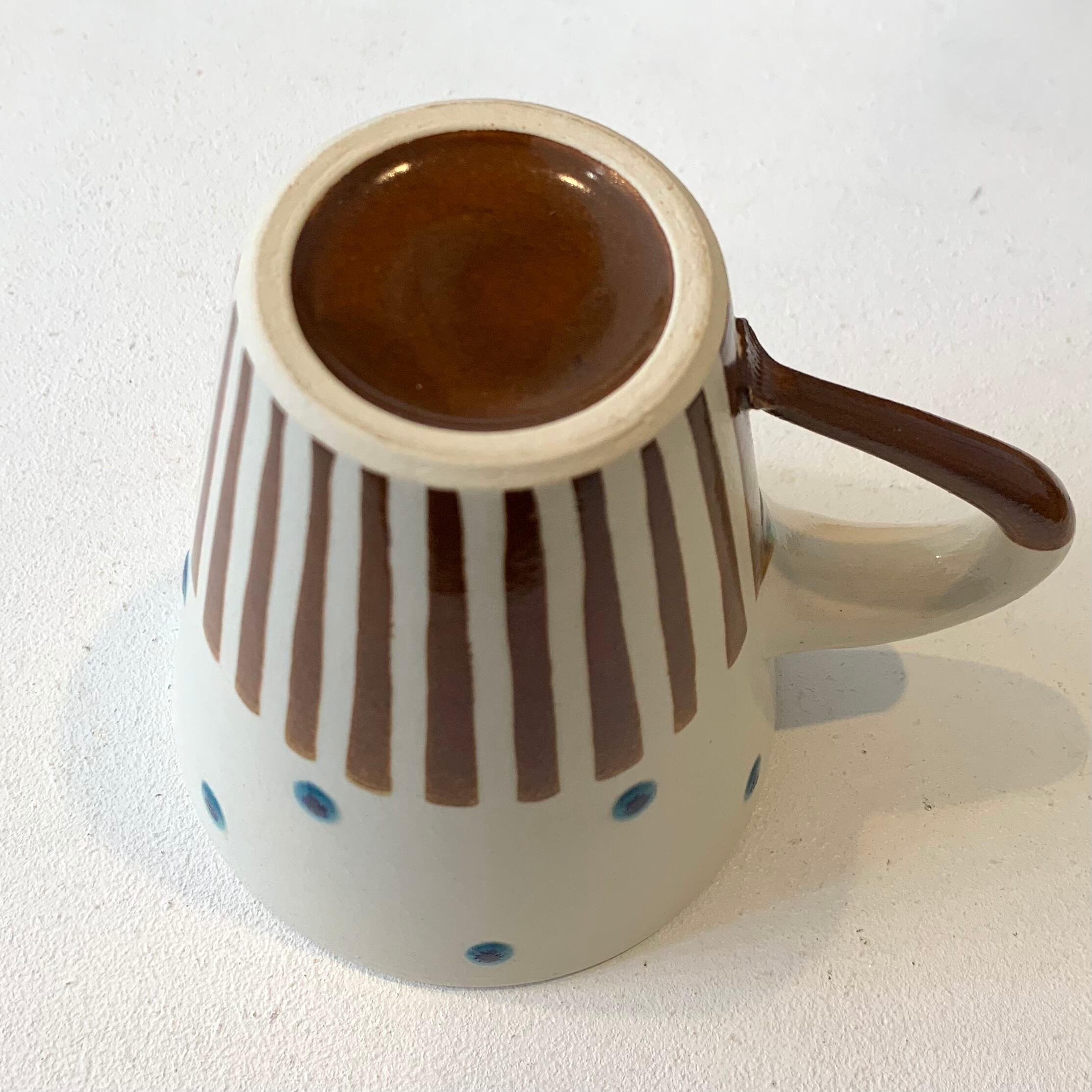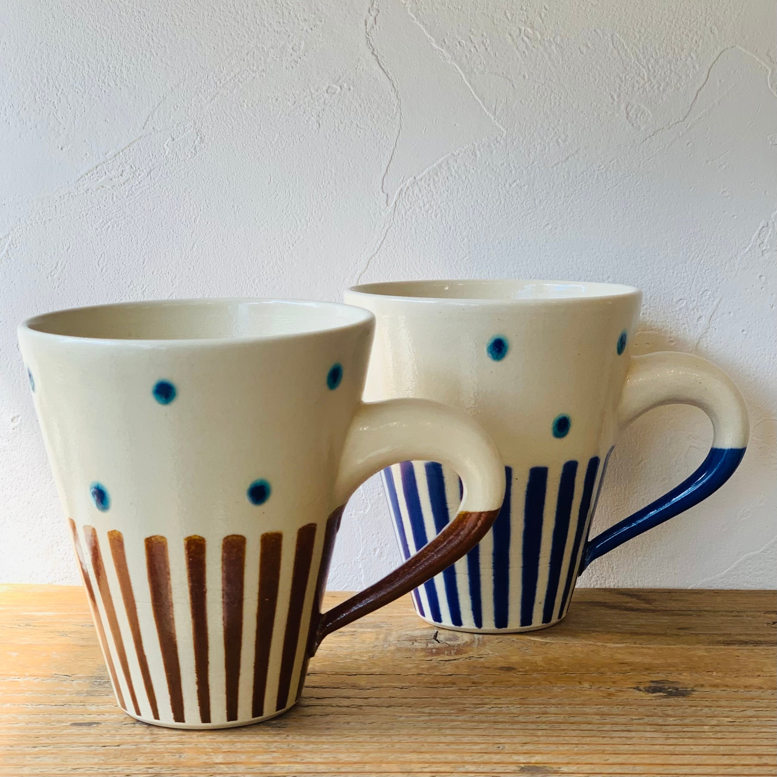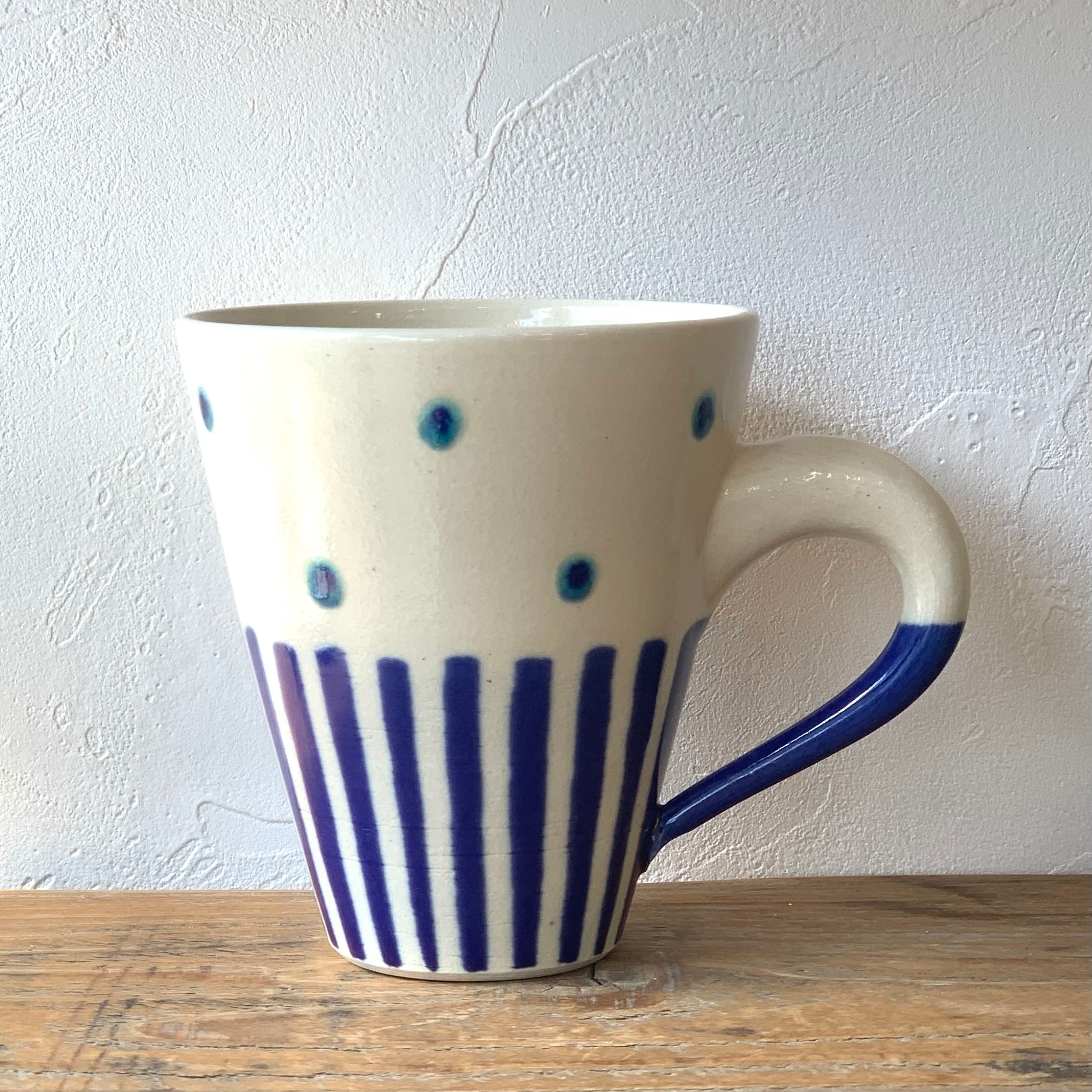 直線的な模様も一つひとつ手書き感溢れるタッチ。シンプルに見えるドットも色味の濃淡の変化が見て取れ、シュッと縦長でスタイリッシュさが強いマグに柔らかさやカジュアルさを与えてくれます。