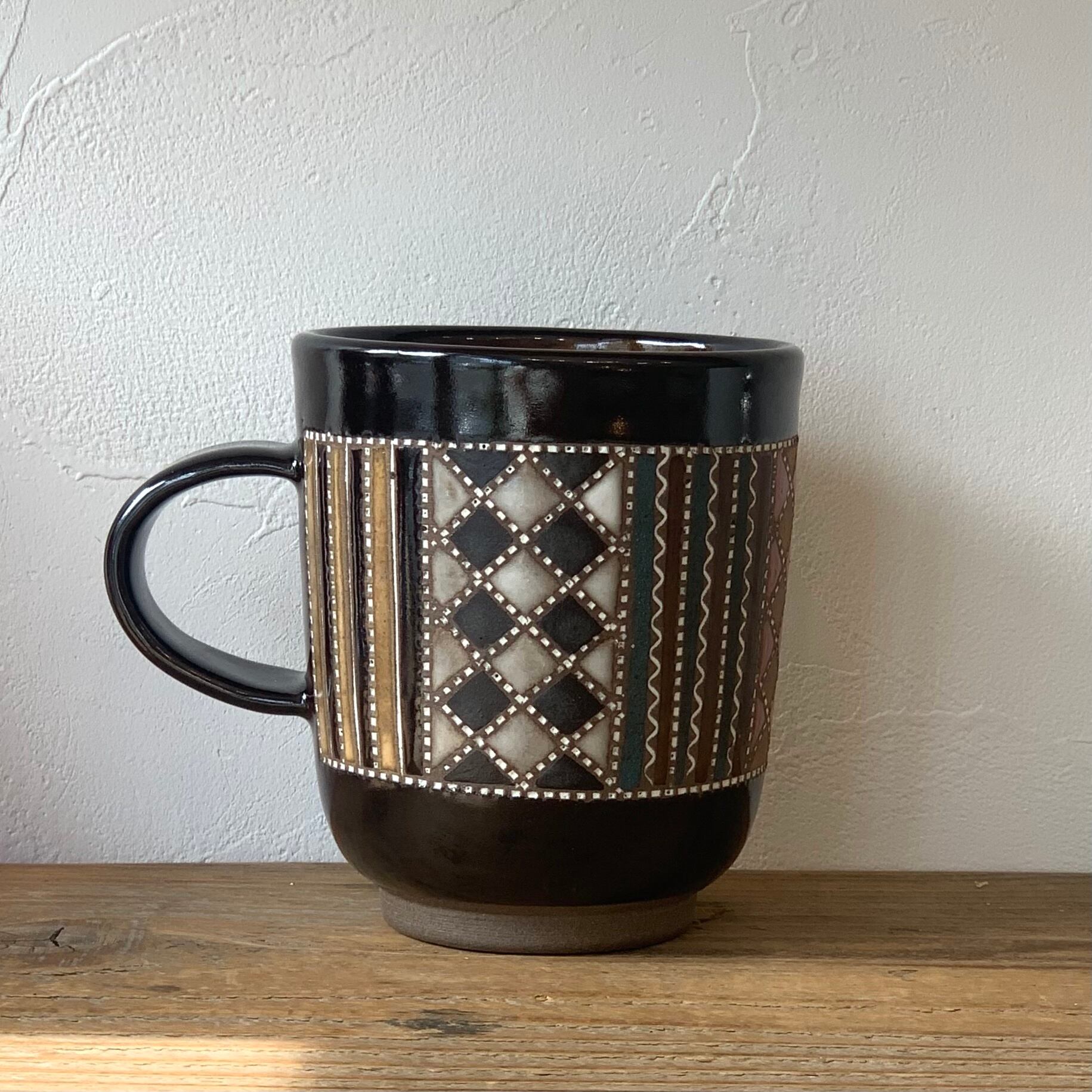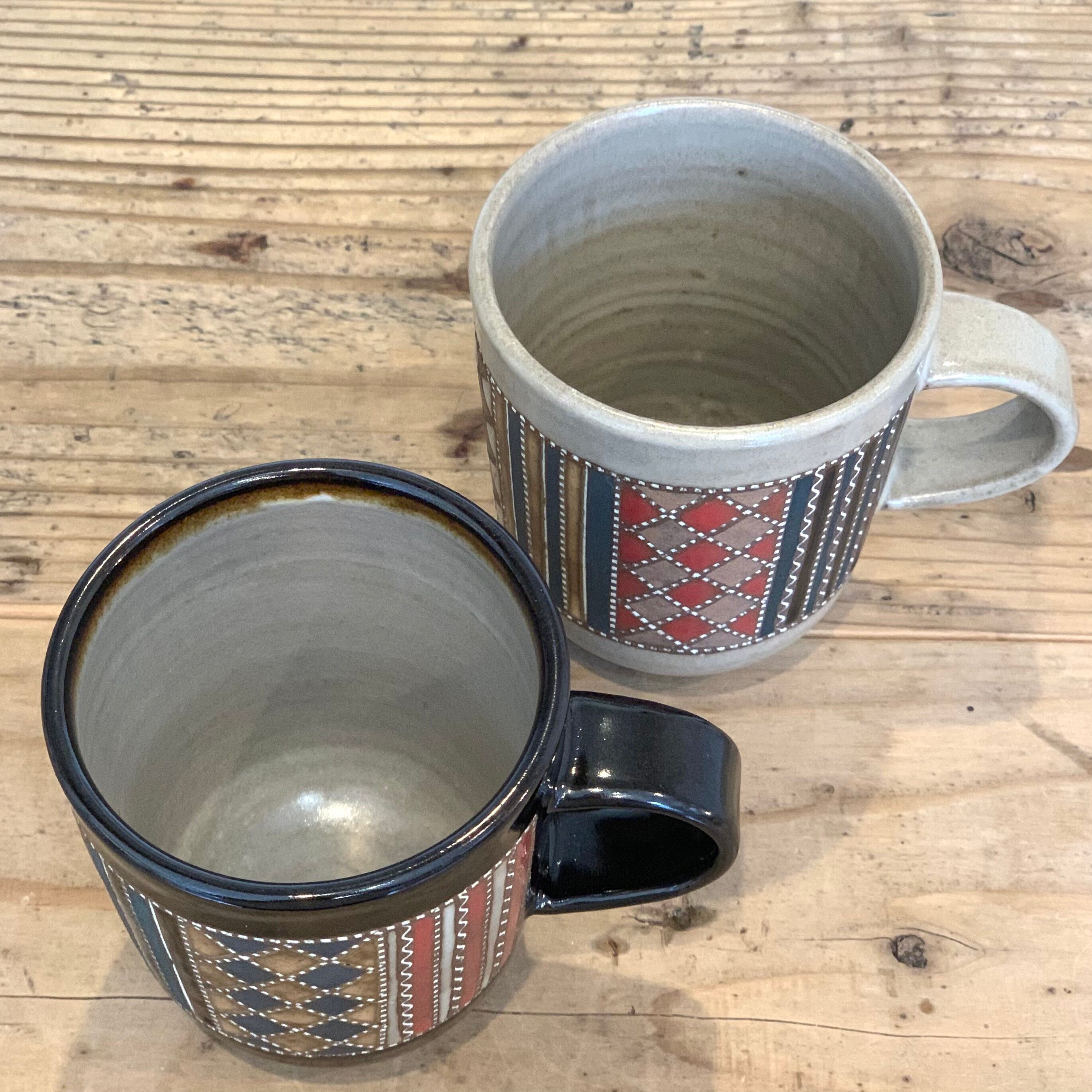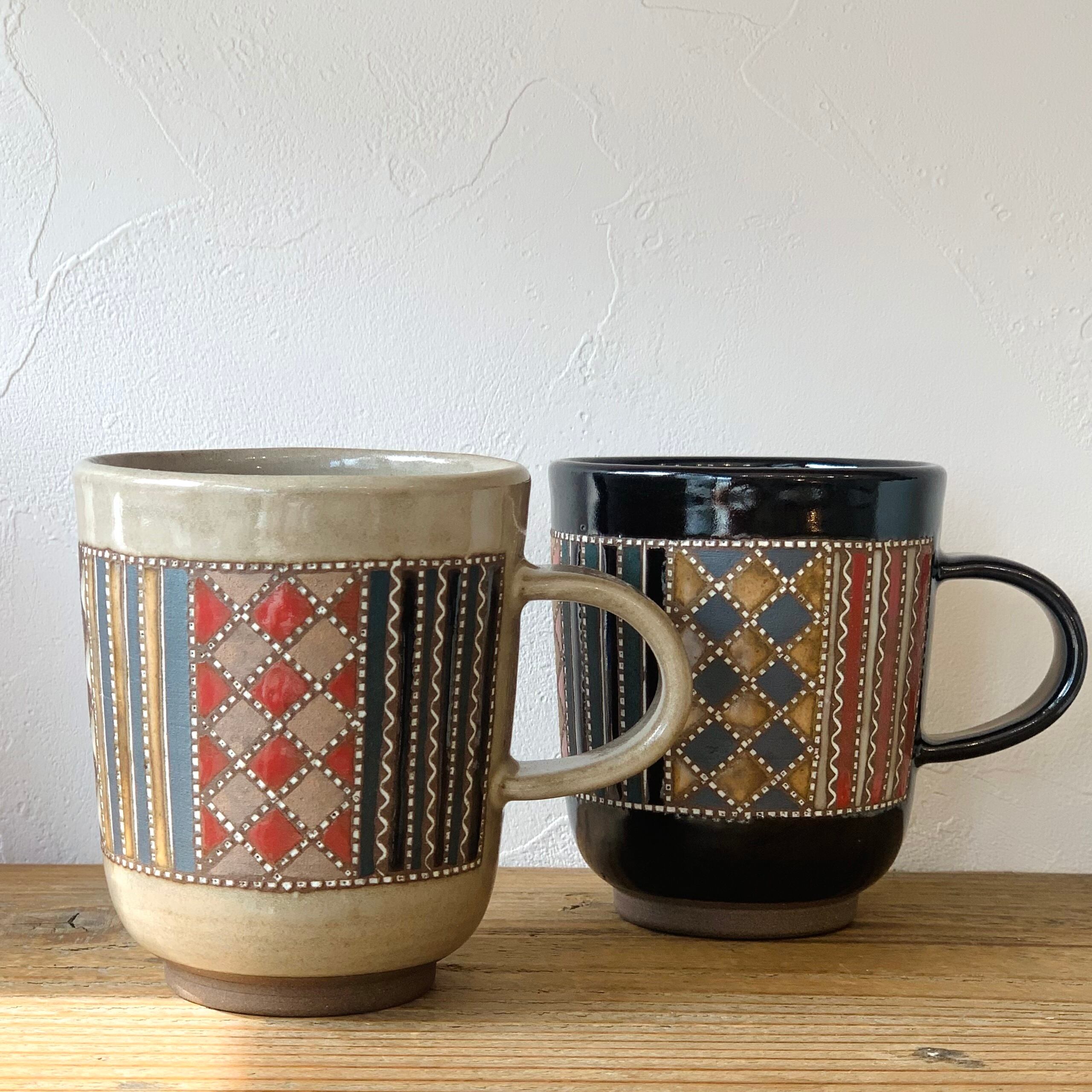 作り手の向山さんならではの表現である象嵌が施された繊細な紋様を、日常にも出番の多いマグカップに印象的にあしらいました。