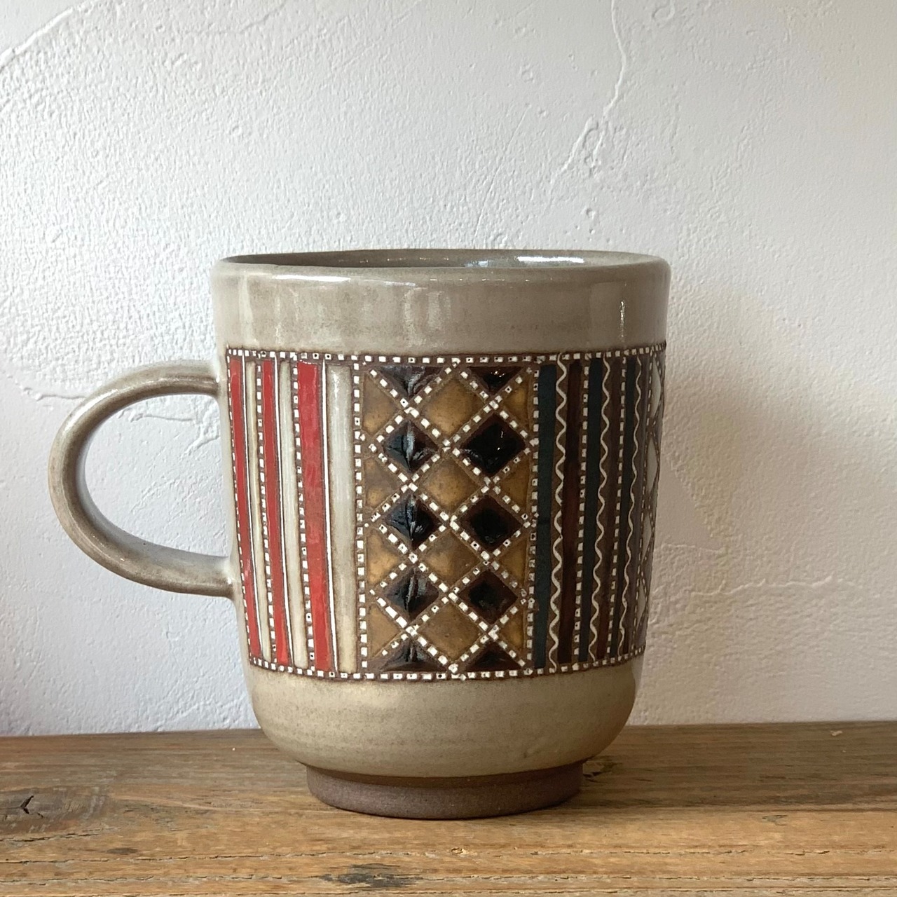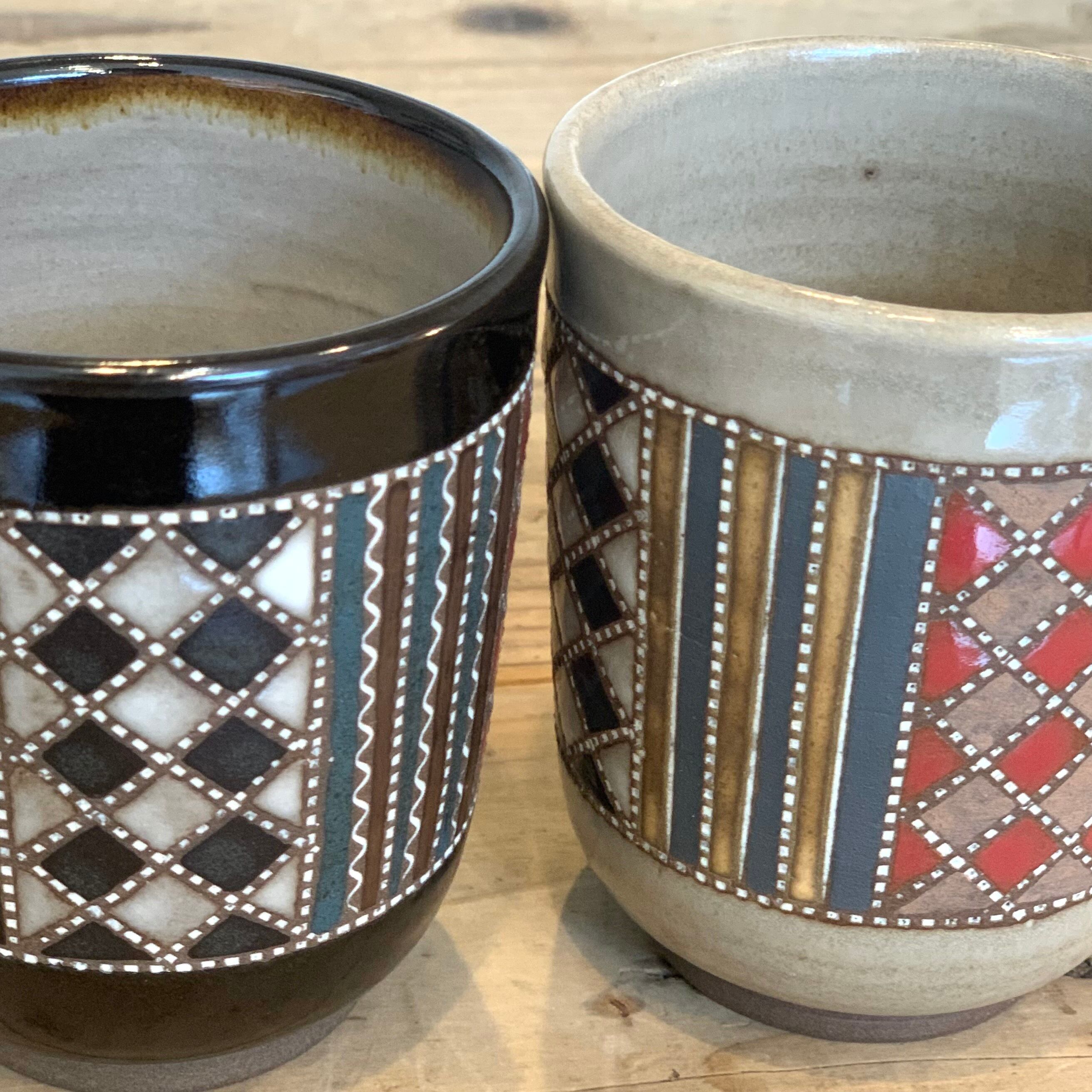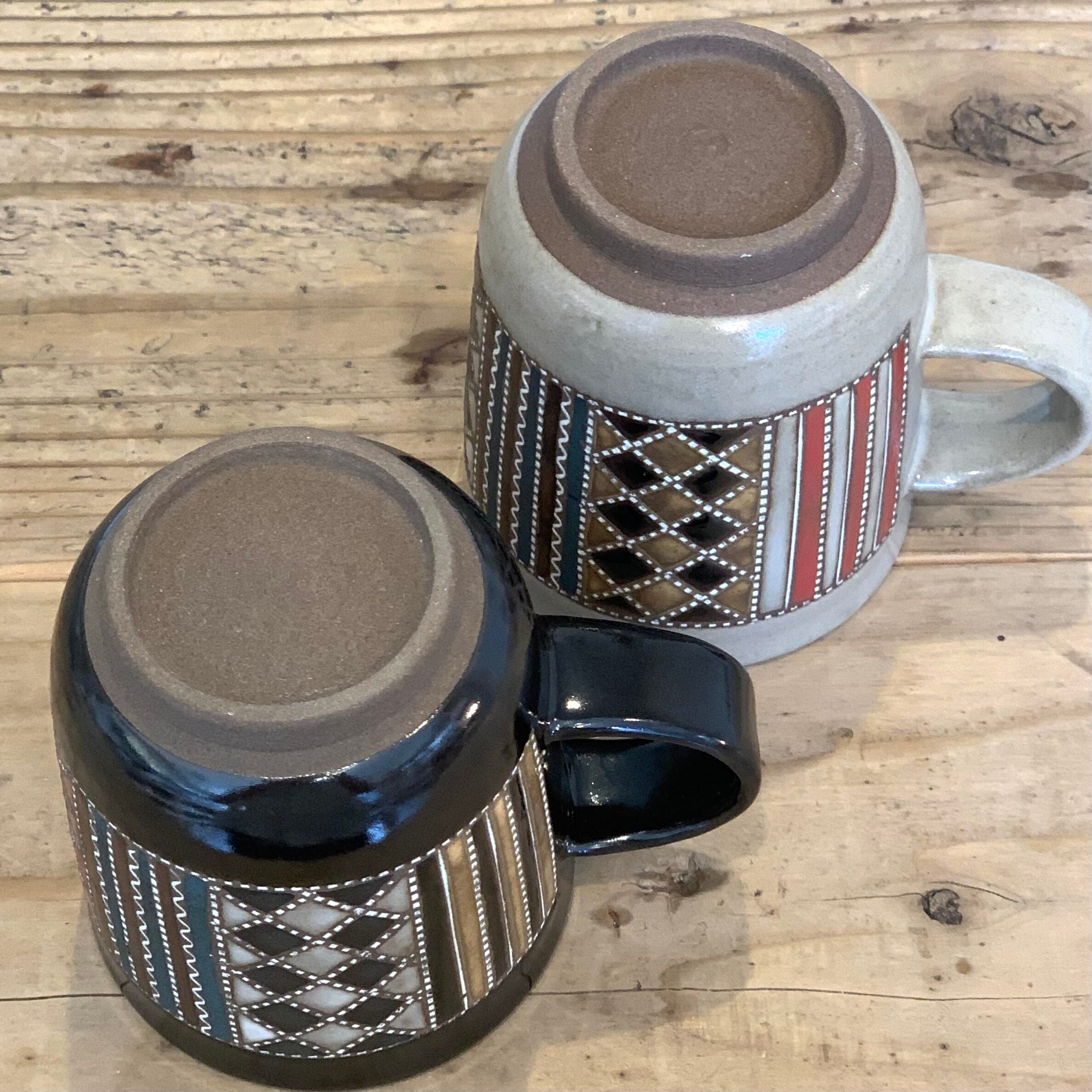 作り手の向山さんならではの表現である象嵌が施された繊細な紋様を、日常にも出番の多いマグカップに印象的にあしらいました。