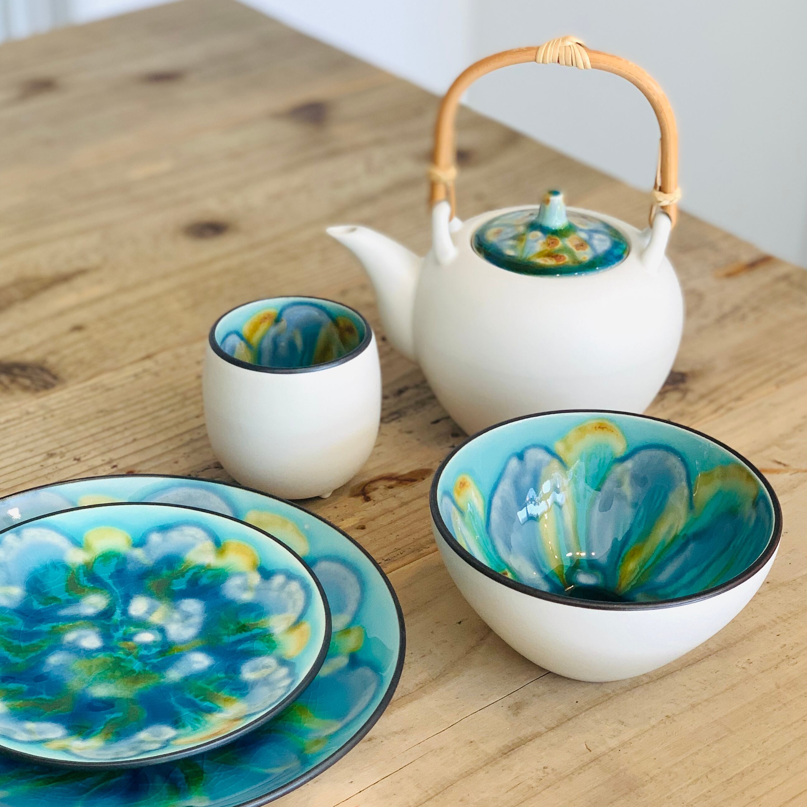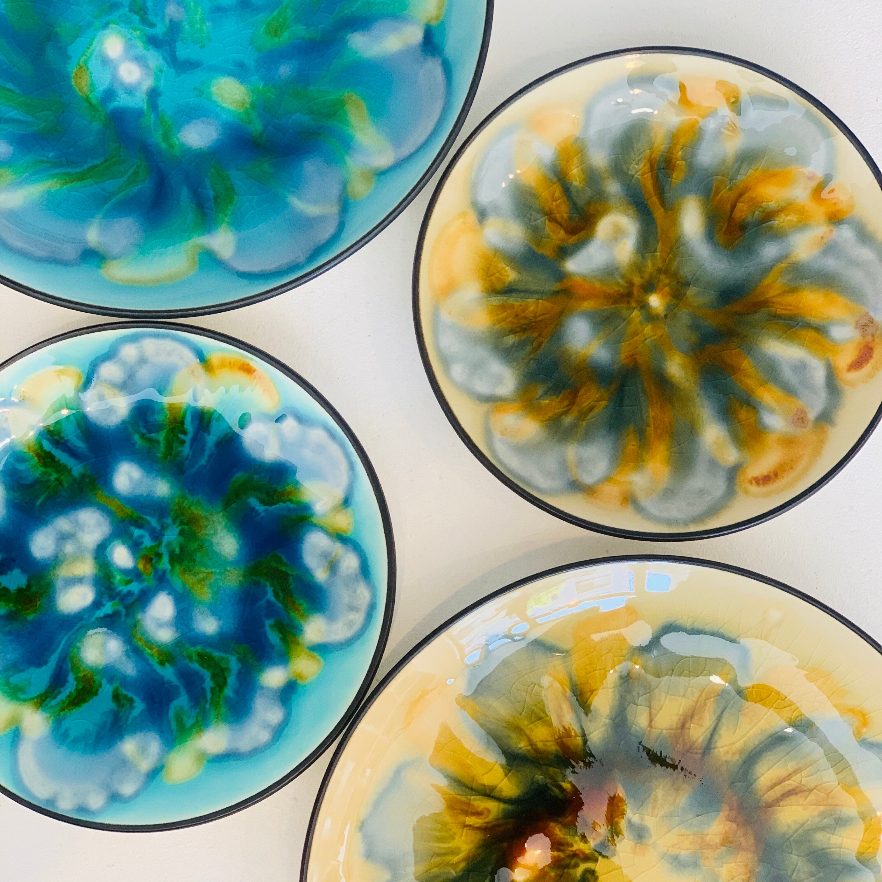 「結晶釉」「窯変釉」など温度調節の難しい釉薬を巧みに使い、独創的な色彩と光沢を表現しています。モノづくりへの強い探求心で、他社が真似しようとしても真似できない表現を生み出しています。