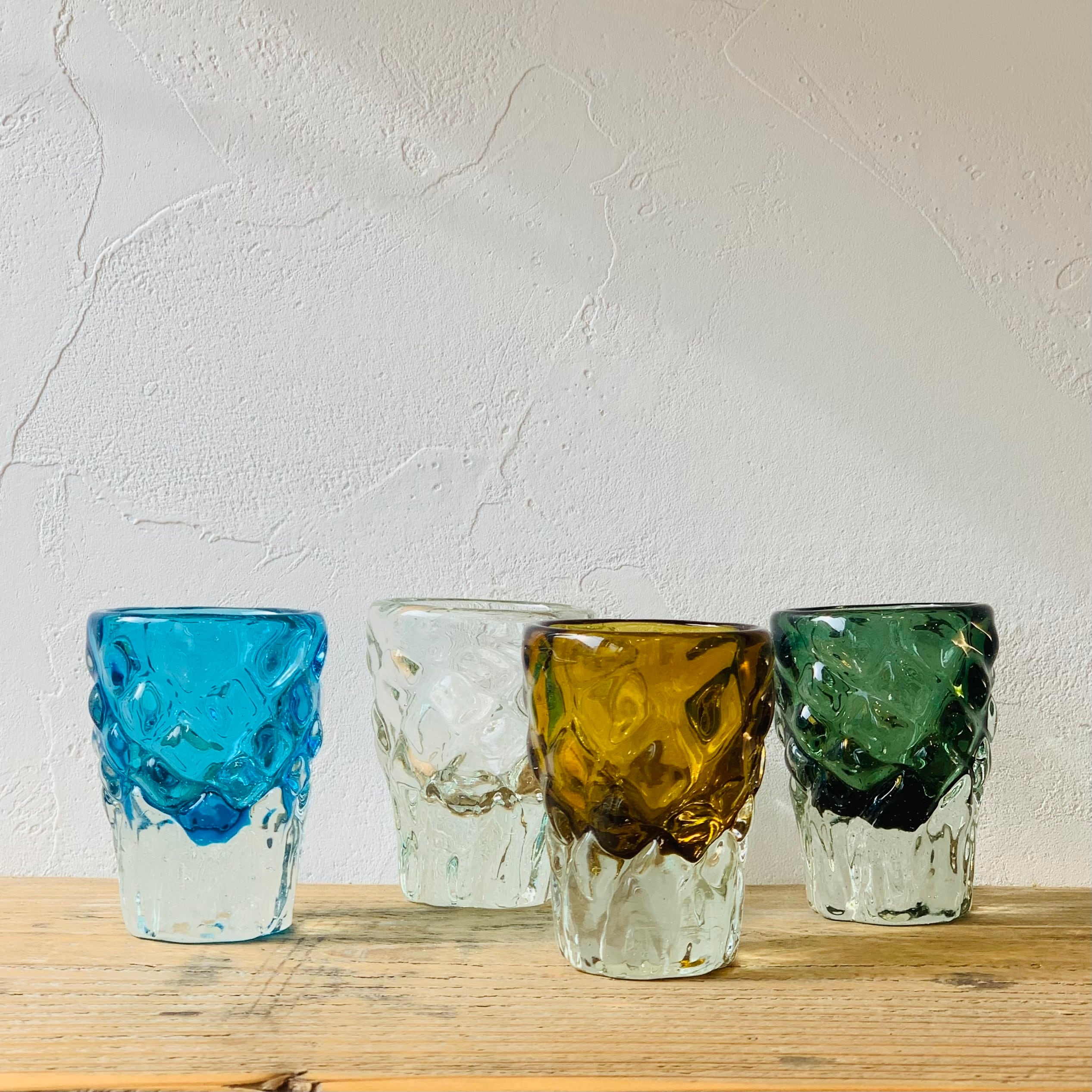 再生ガラスらしい少し緑っぽいクリアカラーや、爽やかな水色。