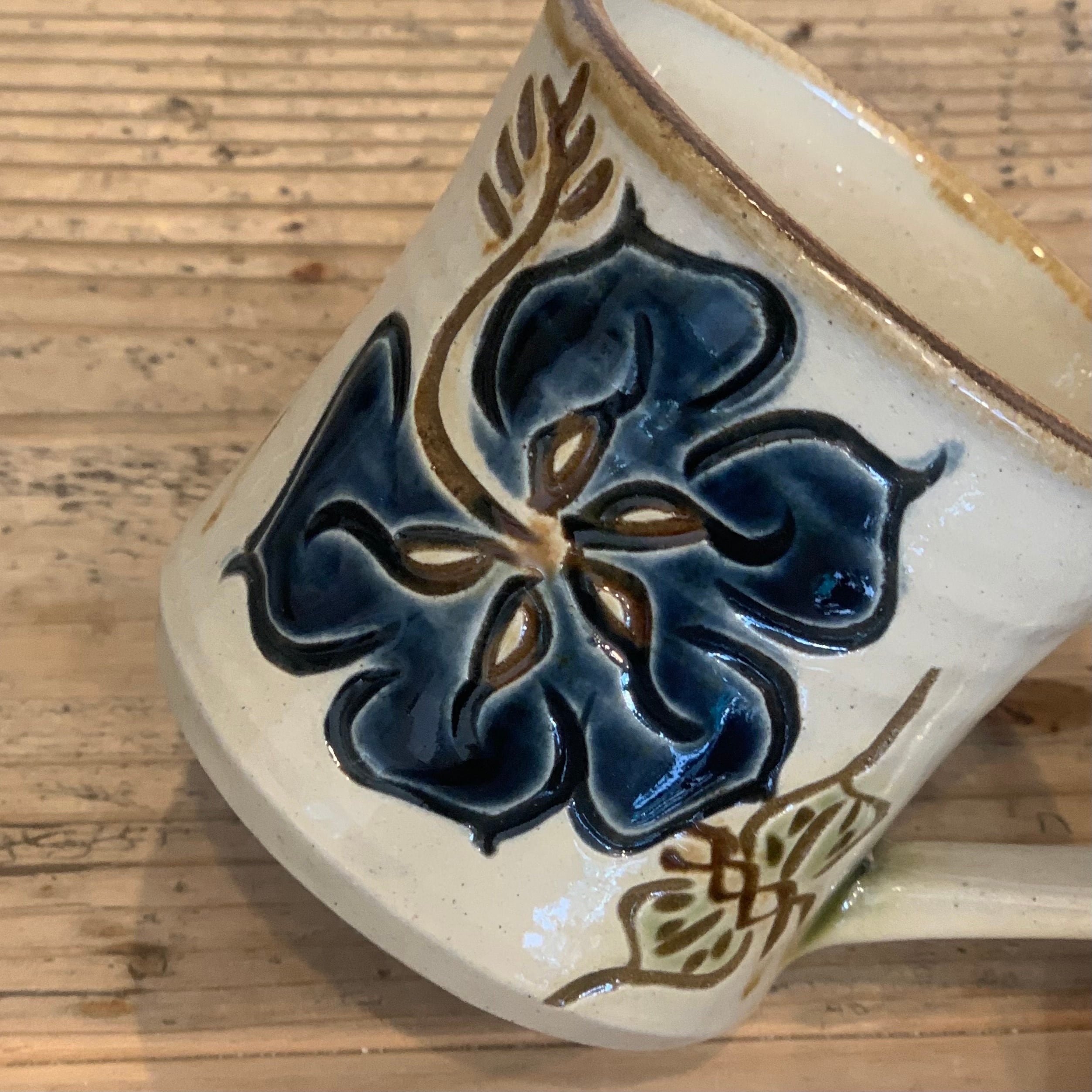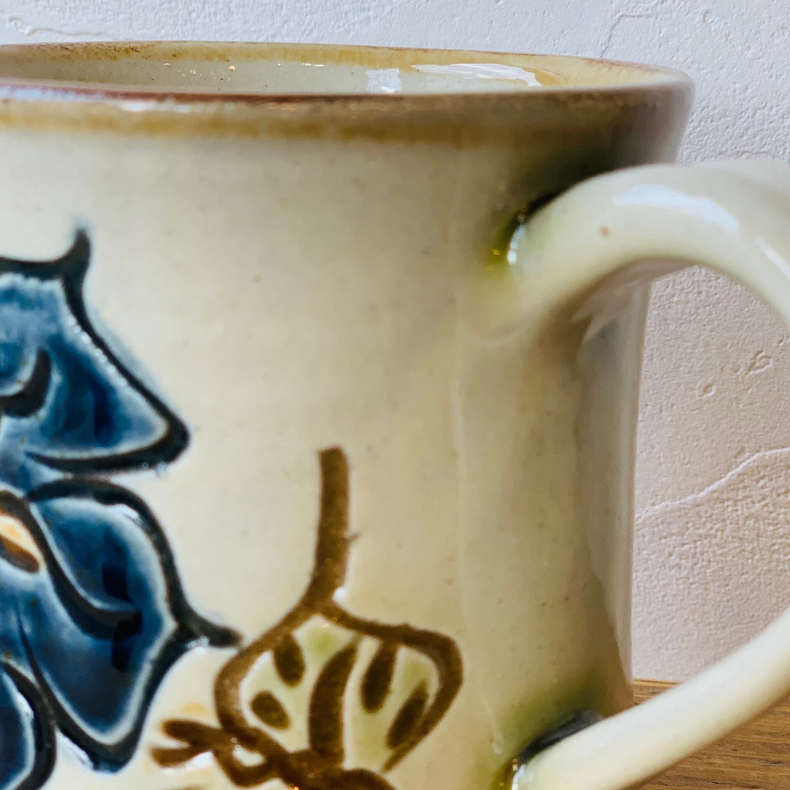 陶芸工房てぃーだの作り手・西口さんならでは表現力と確かな技術の線彫りから生まれる個性的な模様はマグカップにも大きく描かれています。