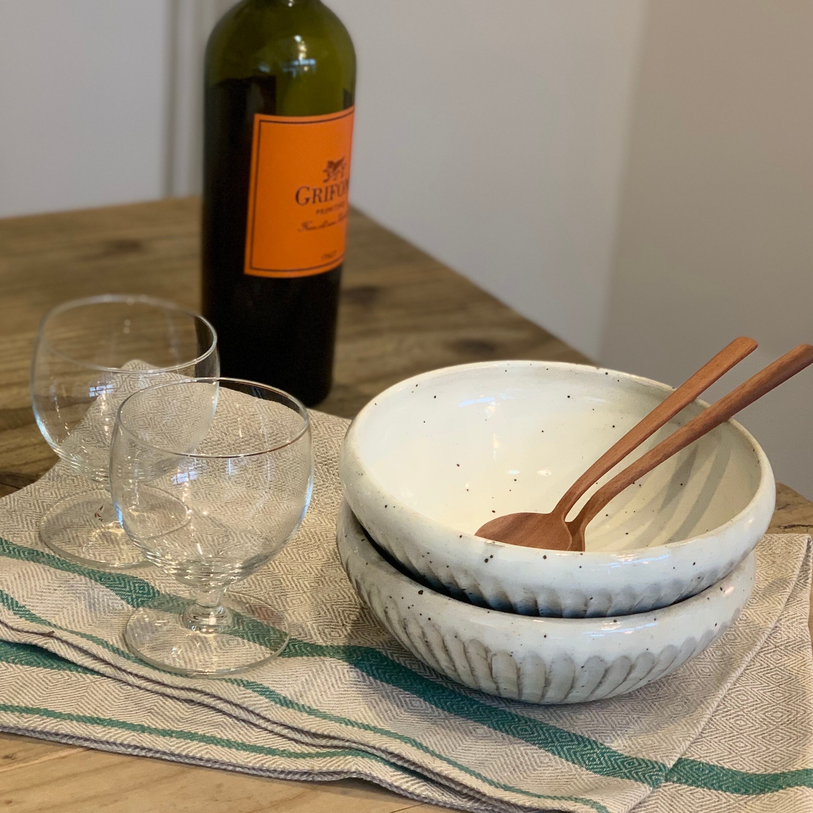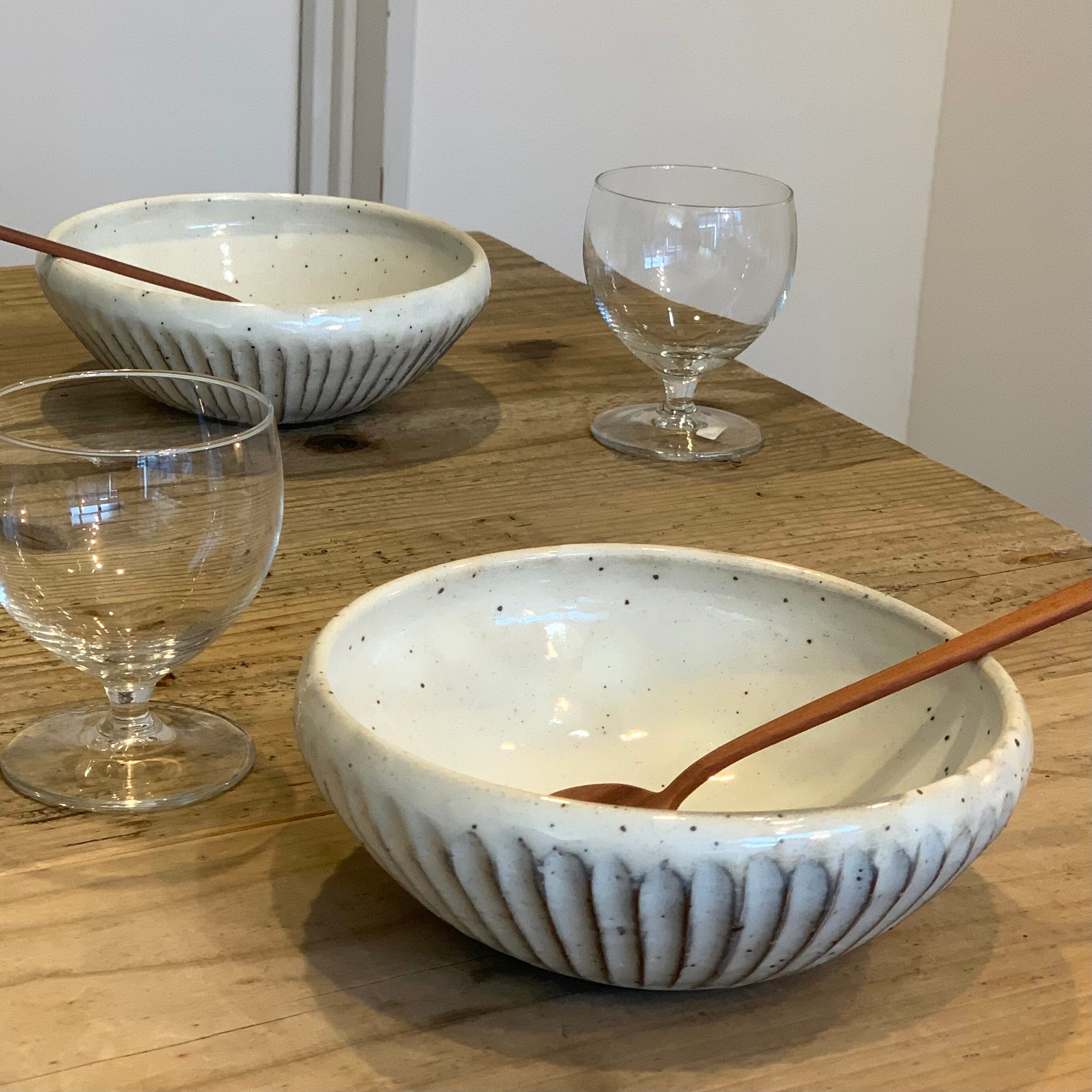 粉引(コヒキ)の技法を使って作られた盛り鉢は、独特な優しい風合いで、自然な色合いがポイントです。例えば野菜との相性が良く、食材の緑や赤や黄色が良く映え、盛り付けられたサラダはまるで美しい花瓶に生けられた季節の香りを運ぶ花束のよう。