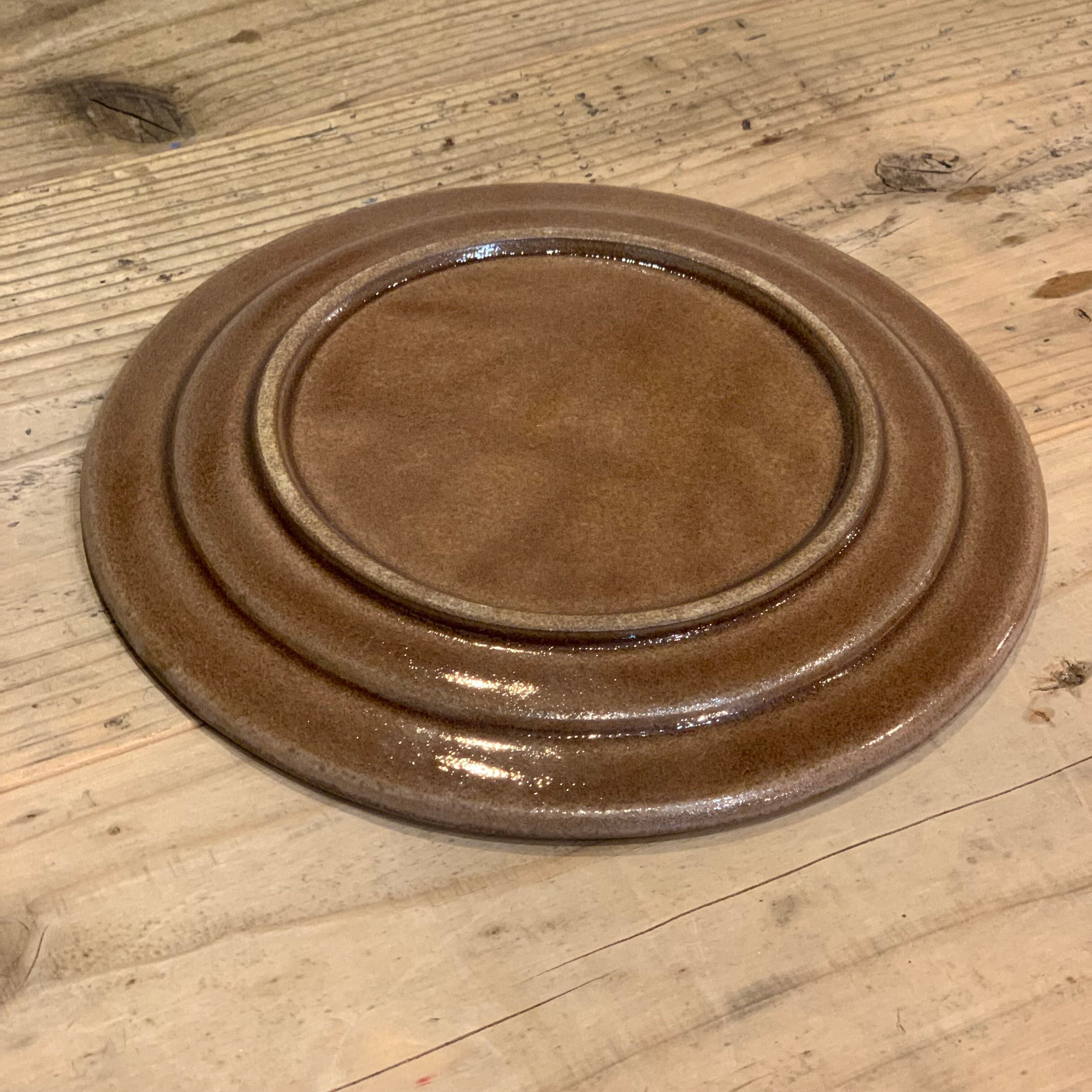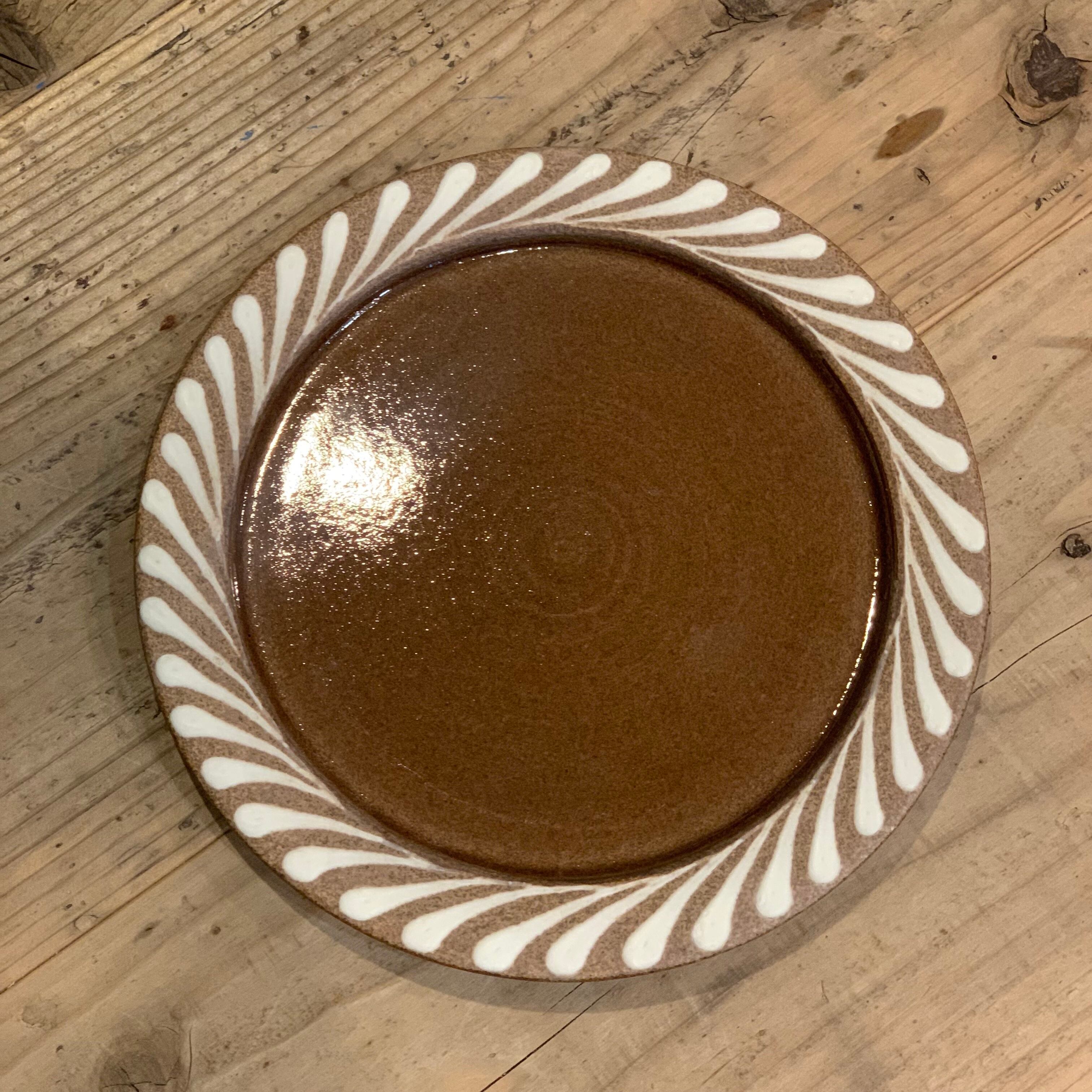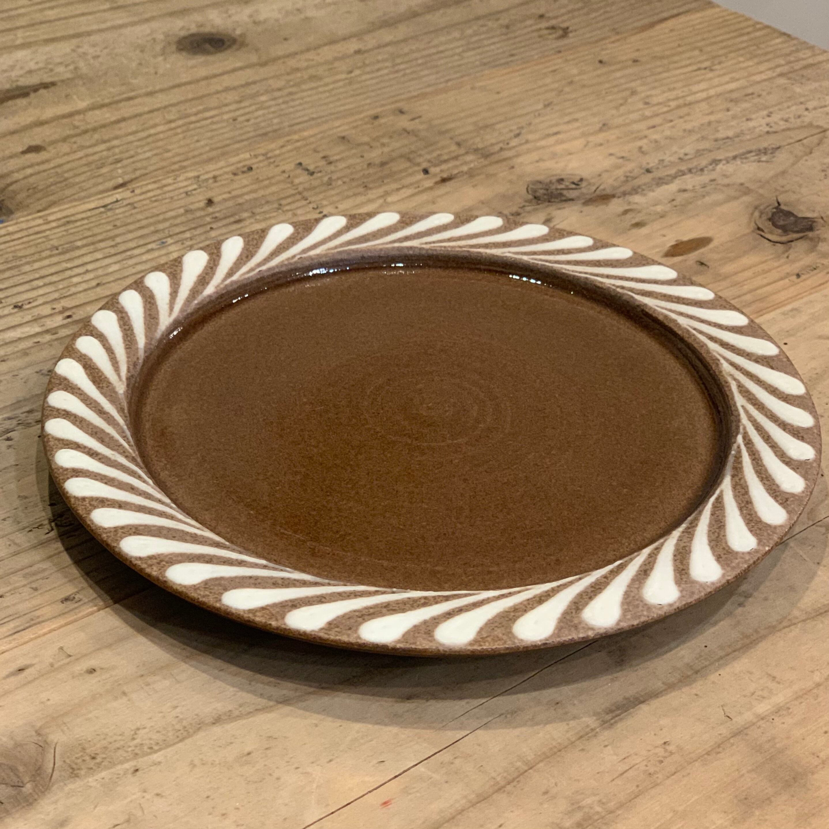 濃淡のある茶色の上に盛り付けられた食材は立体感のある印象となり、さらにリム(縁)に描き出されたいっちん描きの模様が、もう一層深さを感じさせてくれるようです。