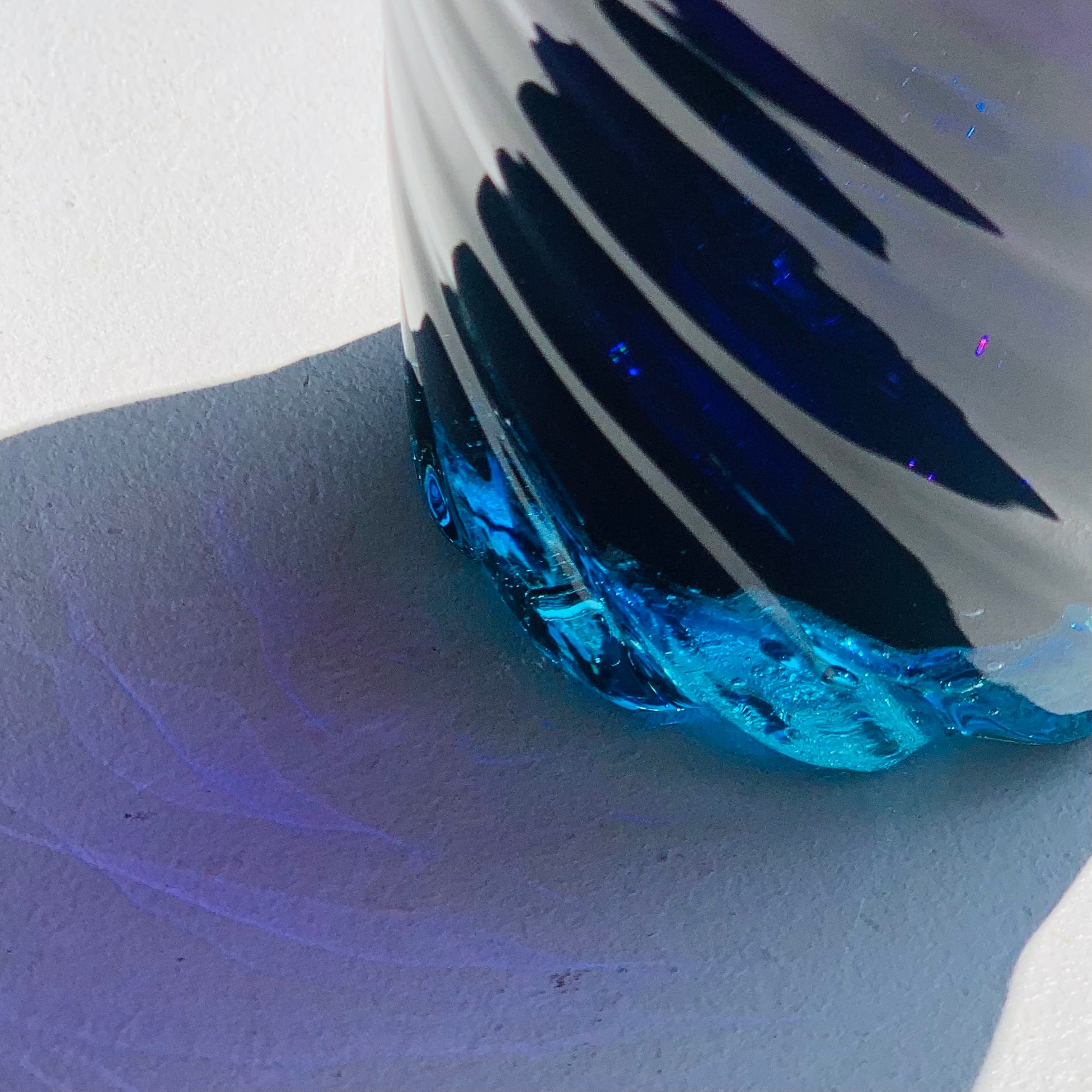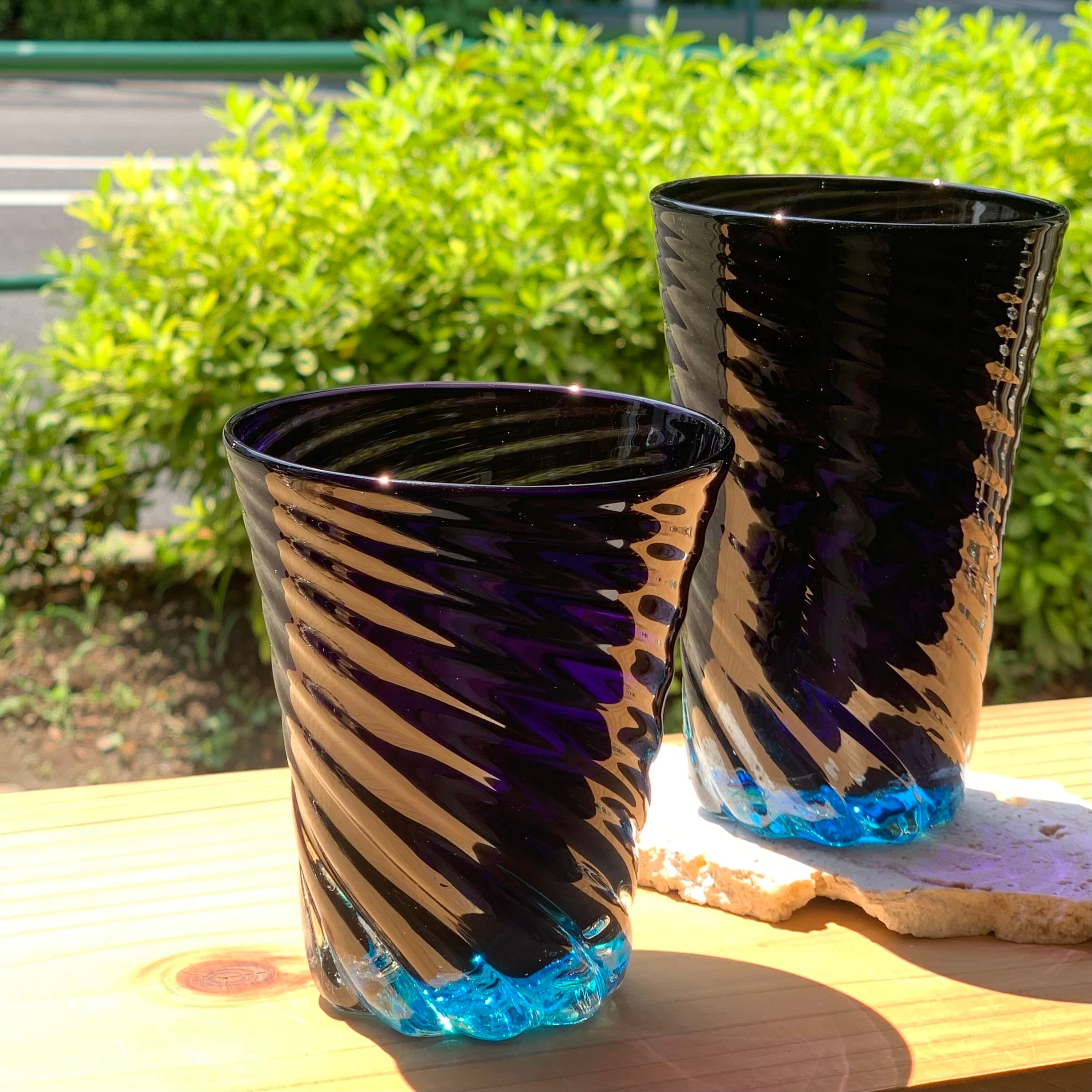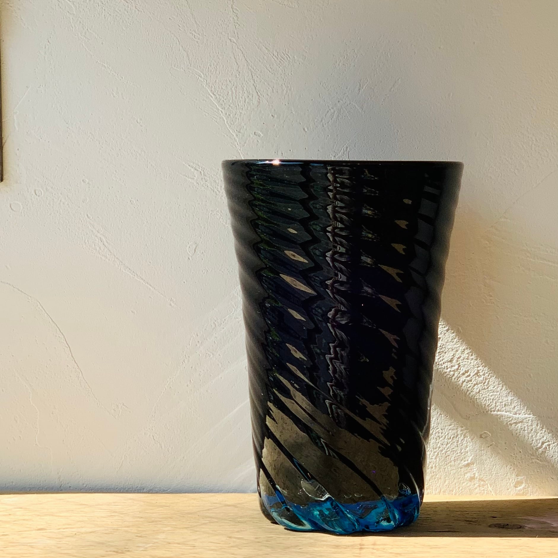 グラスに施された螺旋模様が見せる『青と濃紺と光』が重なった言葉にできない色合いは、ぜひ一度ご自身の目で見ていただきたい美しさです。
