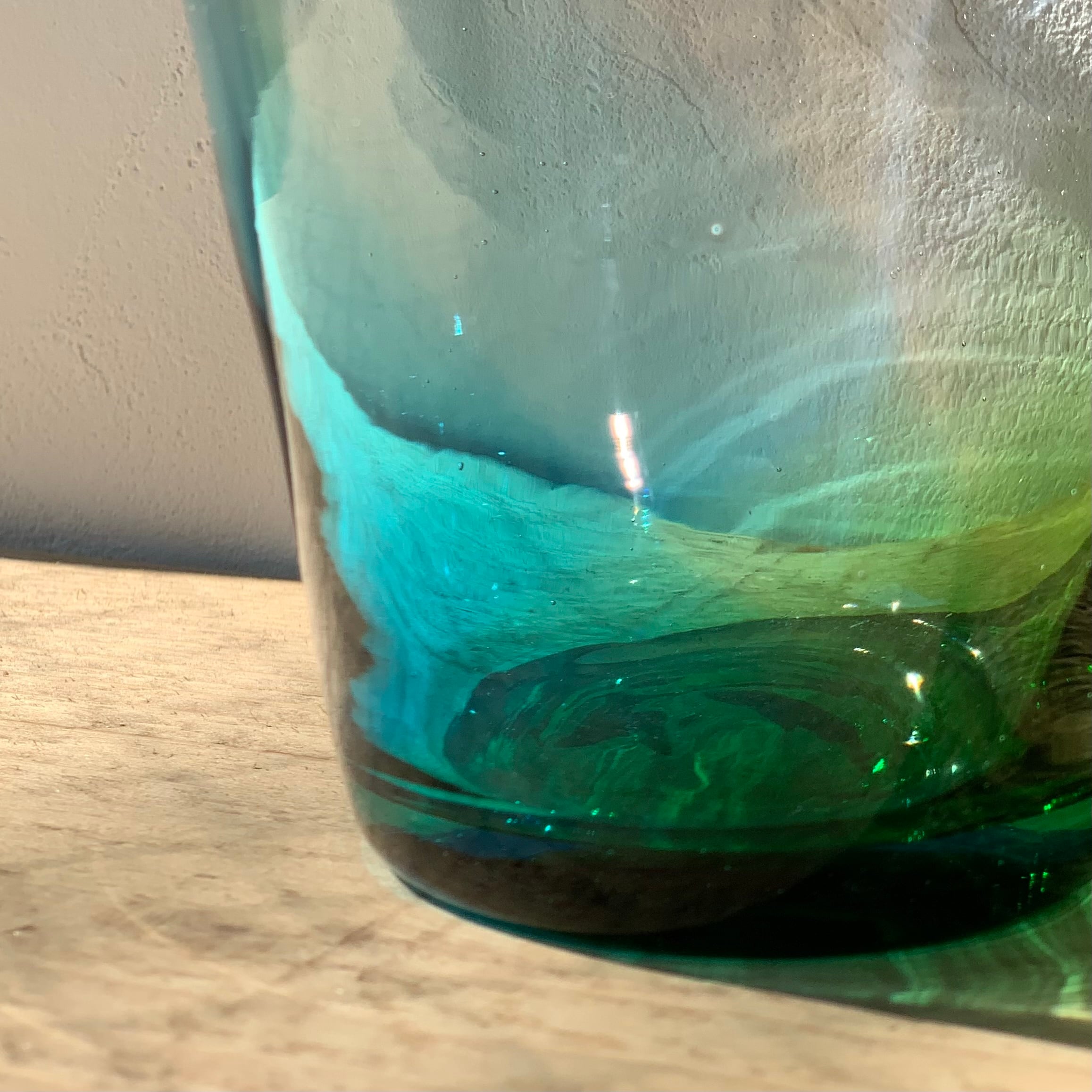 再生ガラス特有の少し緑みがかったクリアと緑と青が溶け込むように合わさった色合いは光を通すと、置かれたテーブルの上を幻想的な海にしてしまうほどの美しさです。