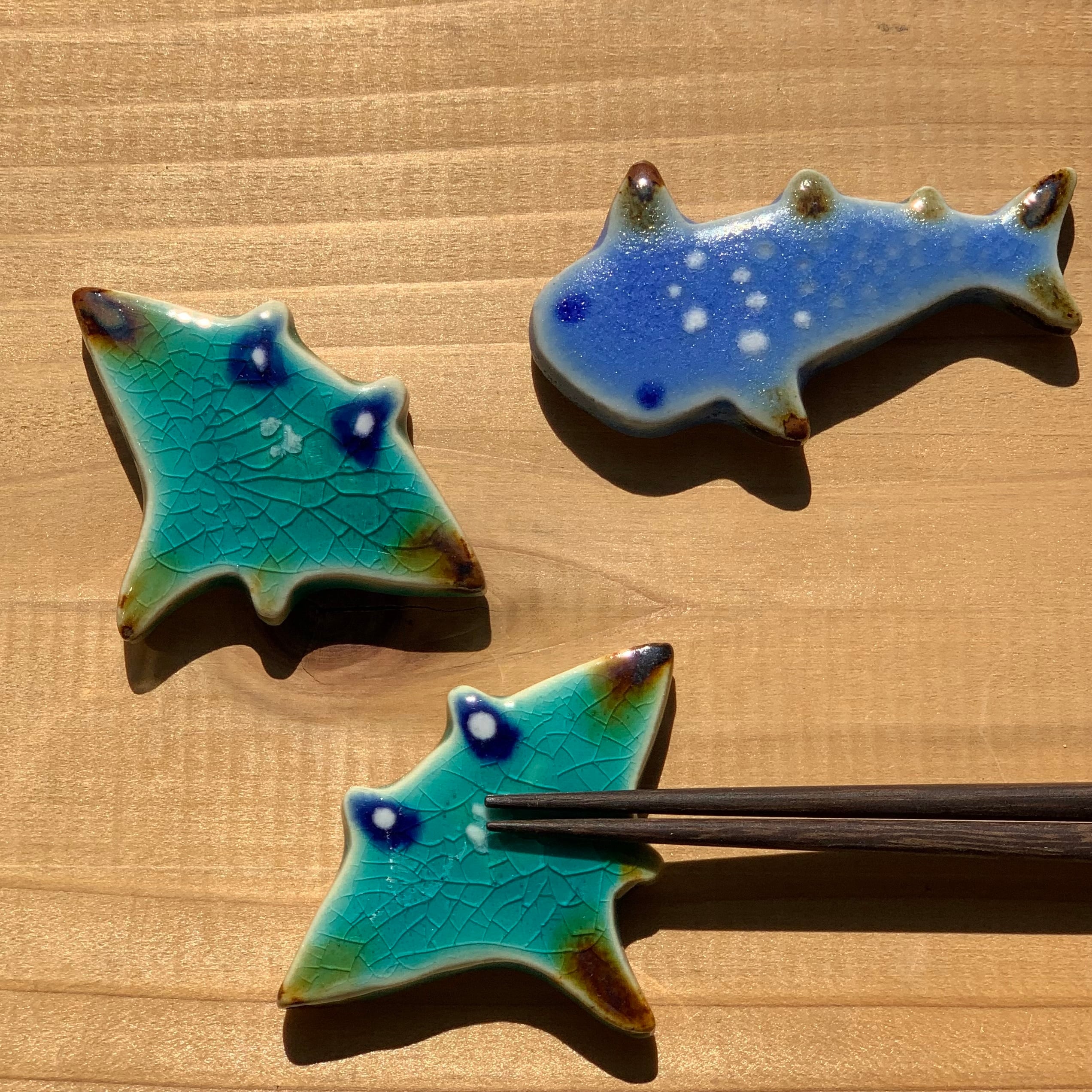 高江洲陶磁器さんのジンベエザメとマンタの箸置き。
