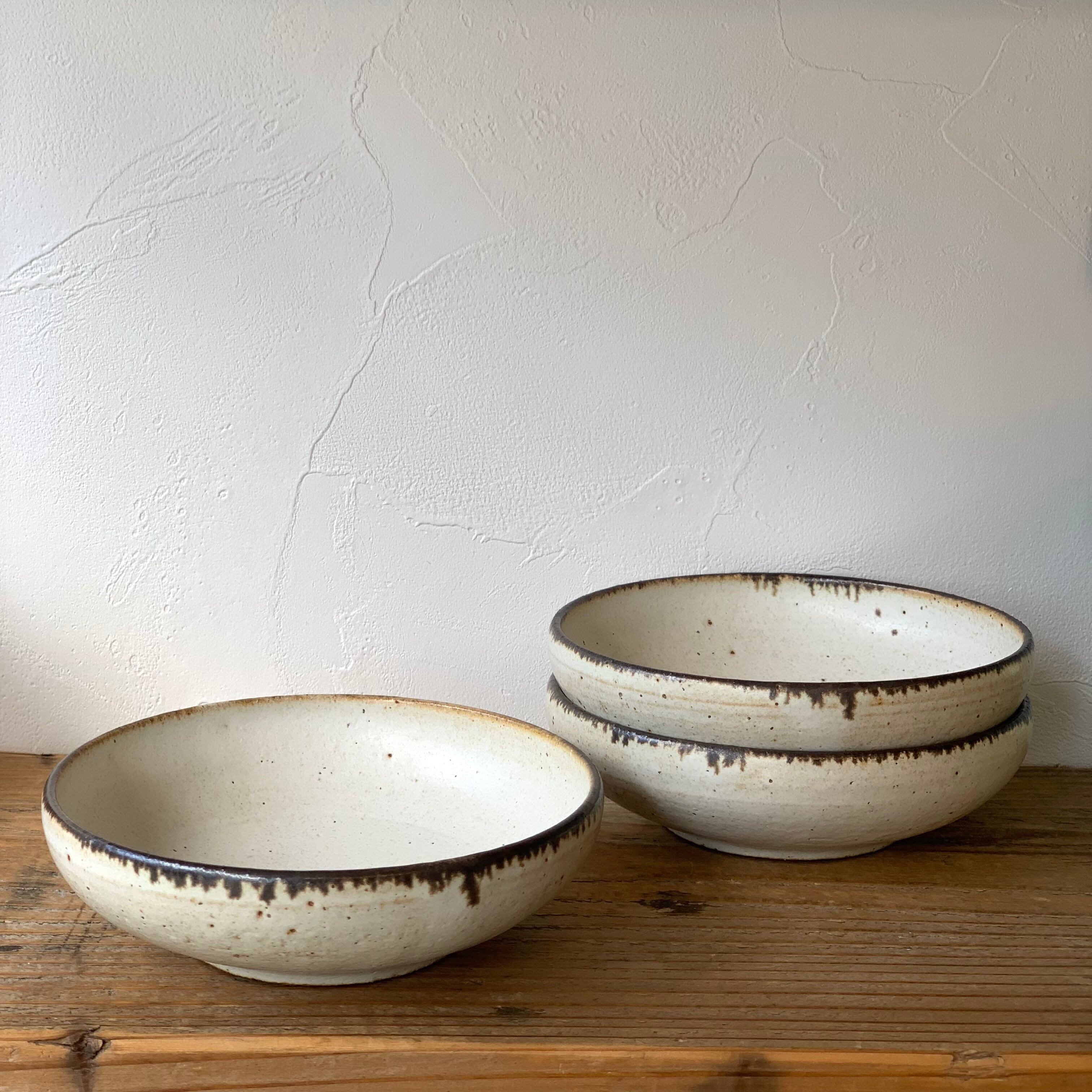 商品によっては、表面および内側のざらつきにご注意ください。裏返してざらざらしている場合は、目の細かい紙ヤスリで軽くこするとなめらかになります。またテーブルがキズつく場合がありますので器を引きずらないようにしてください。 土ものは吸水性が高いため、水がにじみでたり汚れが目立ちやすいものもあります。特に粉引や貫入の器は 米のとぎ汁で約10分間煮沸(弱火)して、そのまま冷まし水洗いしてください。汚れがつきにくくなります。貫入が入っていたり、水、お湯等に浸した場合、変色することがありますがうわぐすり(釉薬)の特徴ですので品質に問題はありません。