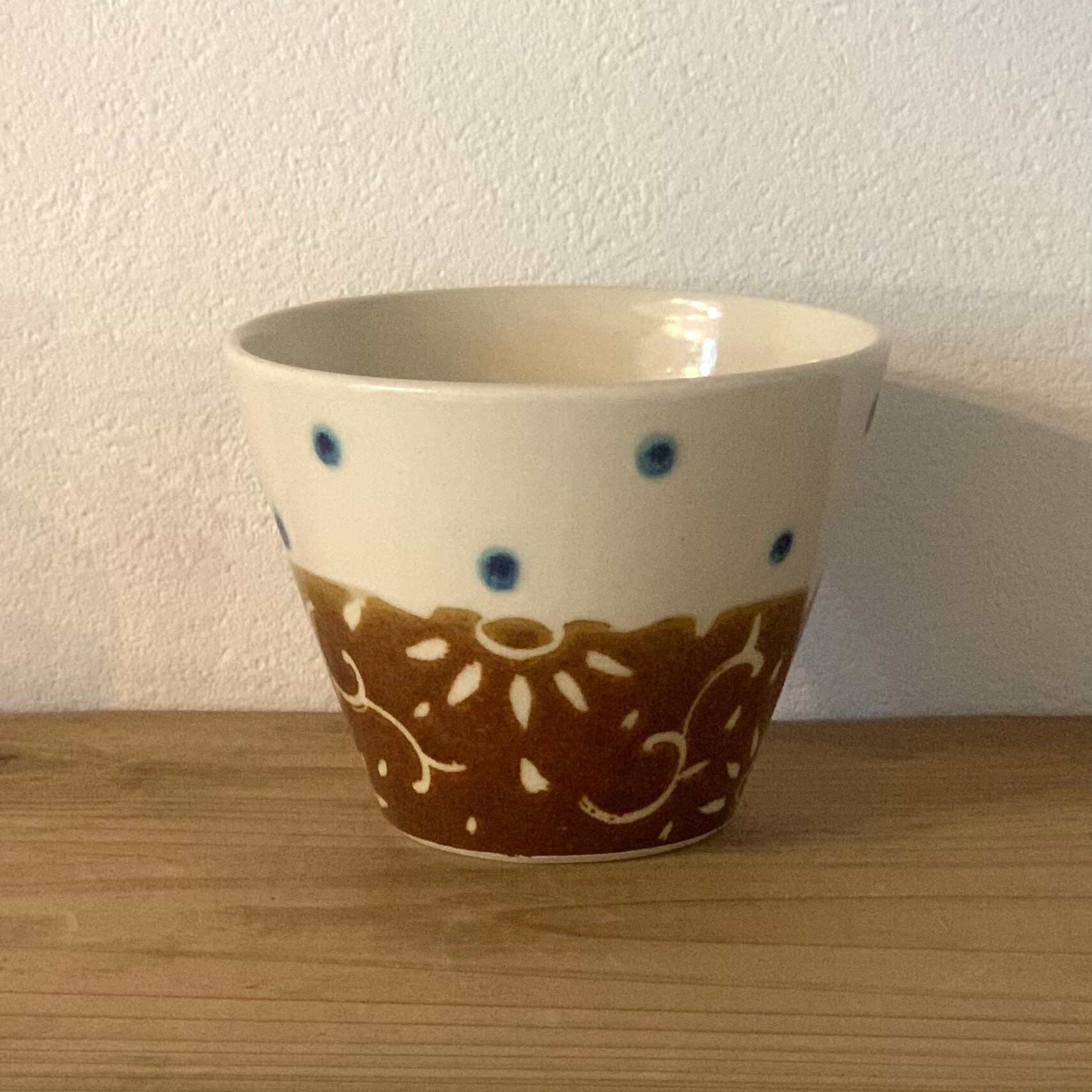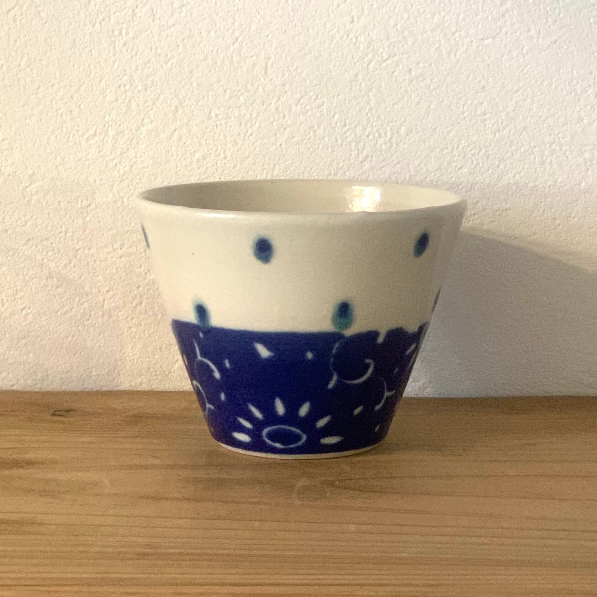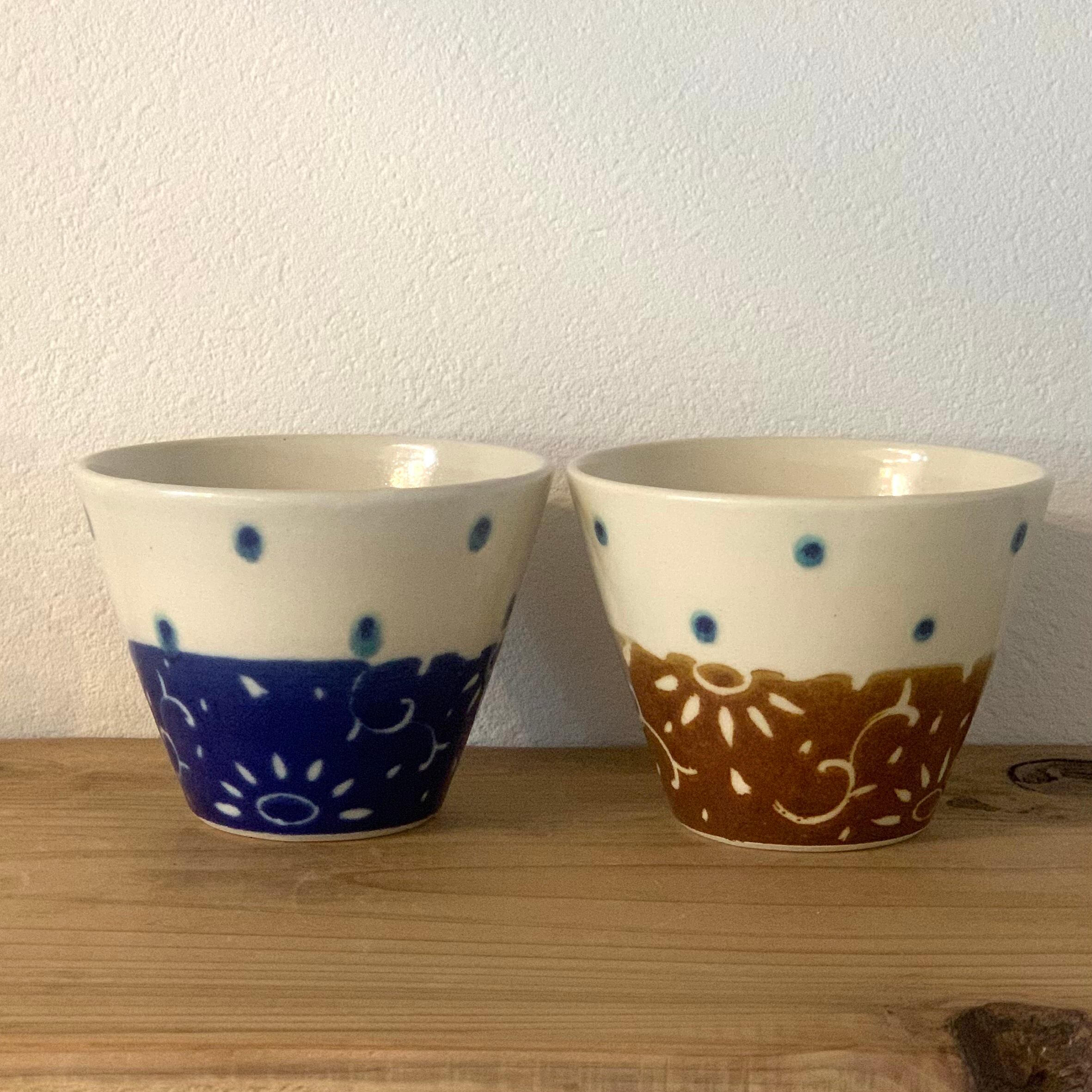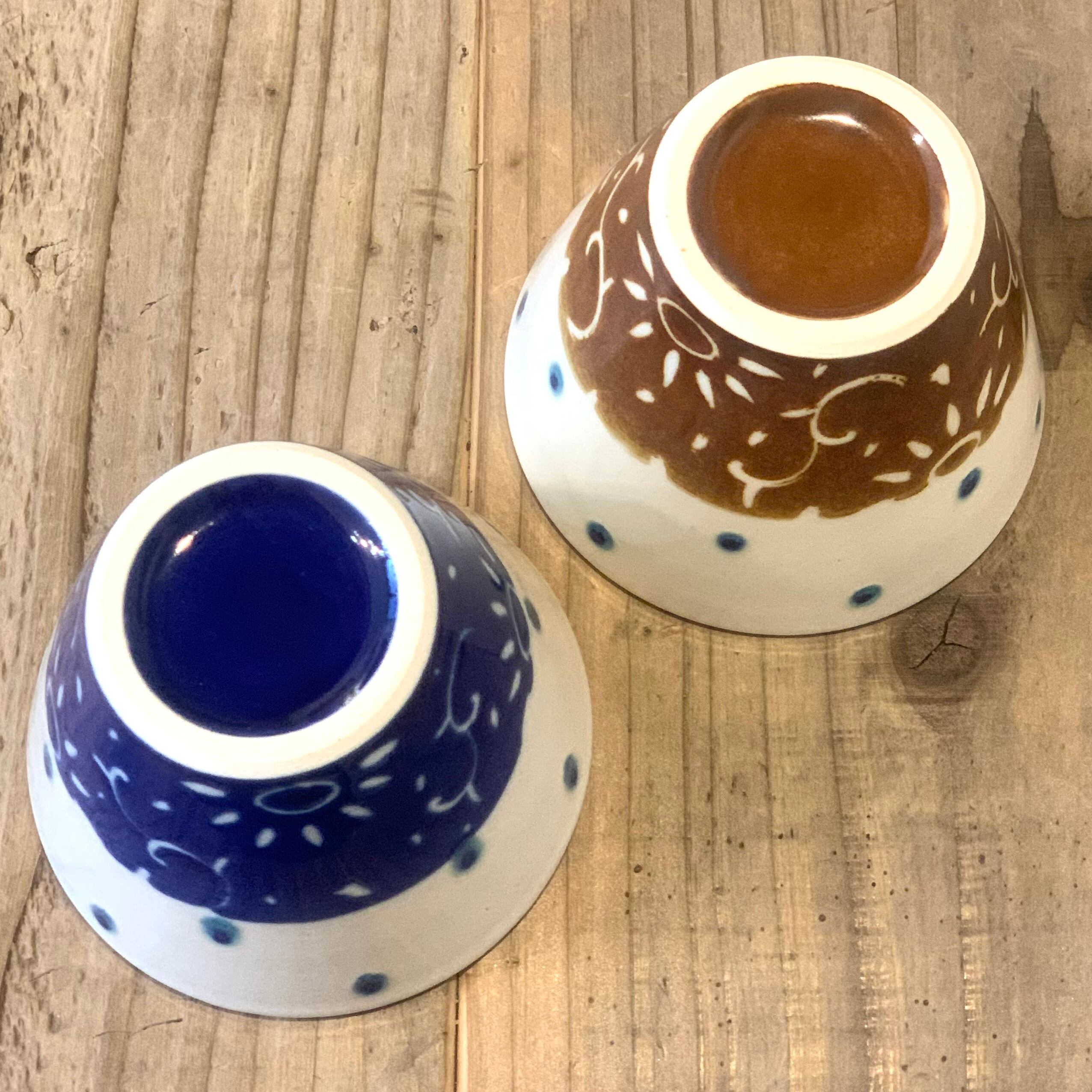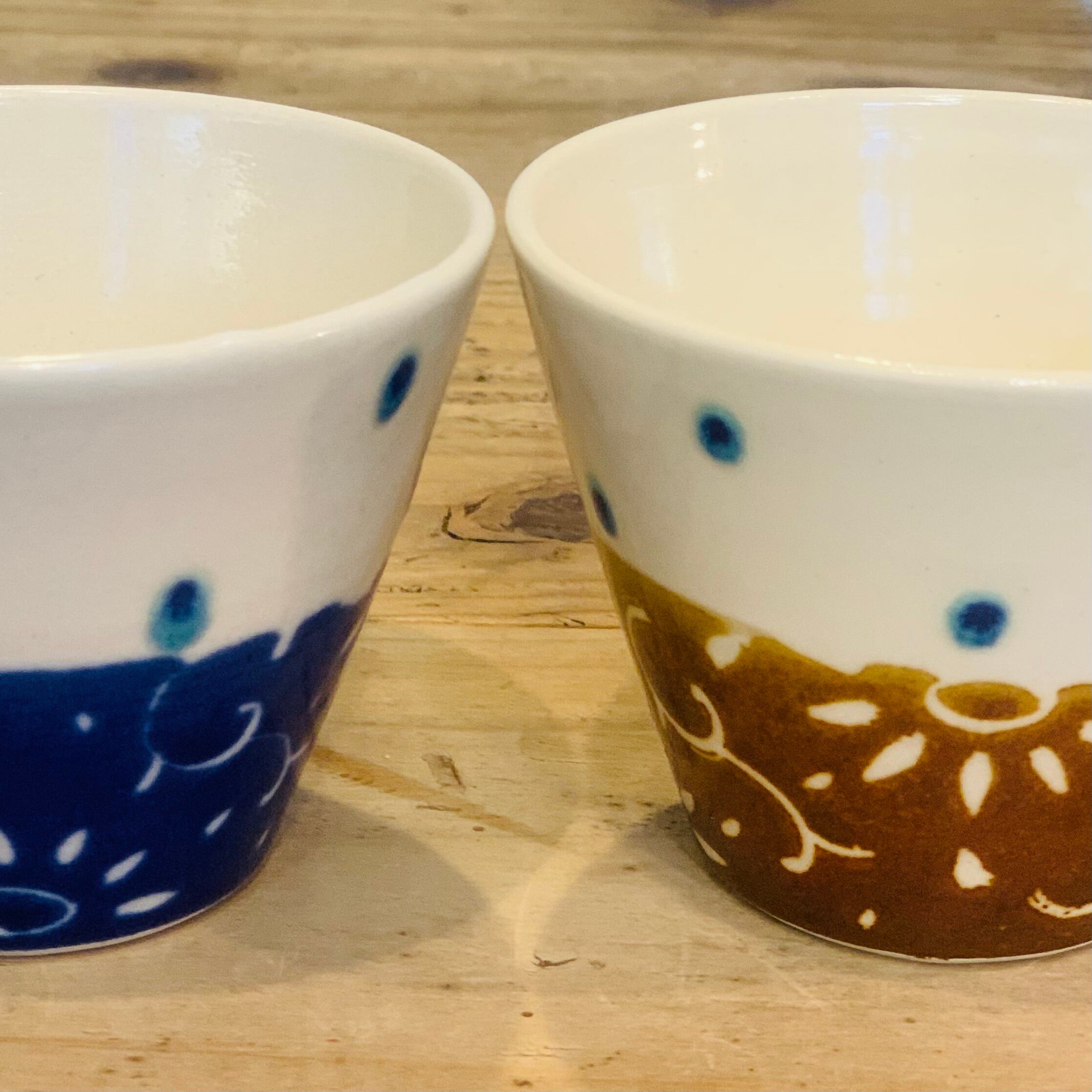 手に取りやすく、軽快な印象を与えてくれるコーン型の可愛らしいシルエット。丁寧で繊細、でも遊び心がある模様。そして艶やかであってもしっかりと温もりを感じられ、心をほっこりさせてくれる釉薬の色味。ベースとなっている白も柔らかく、注いだ汁物や料理の明るさを引き出してくれるような色合いです。