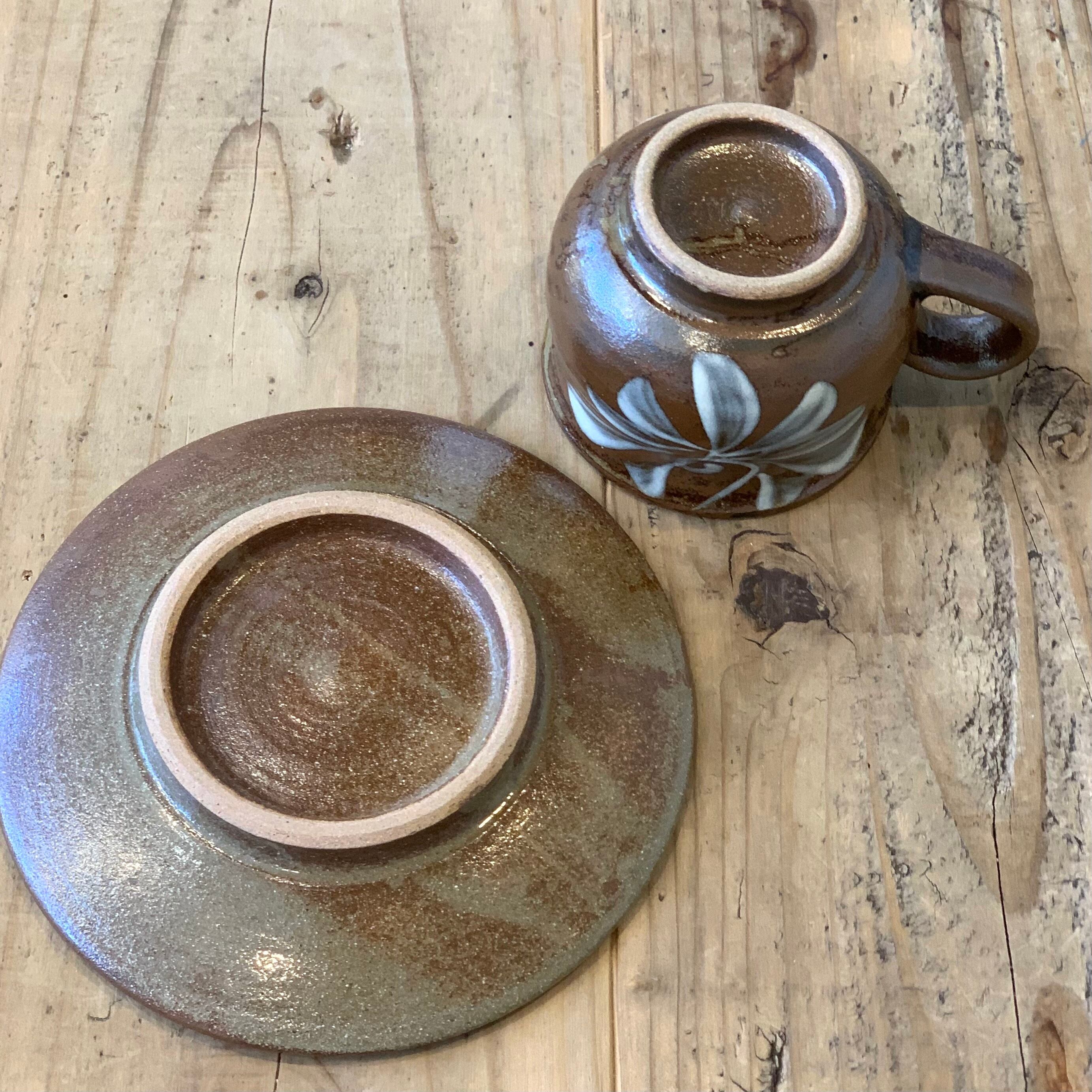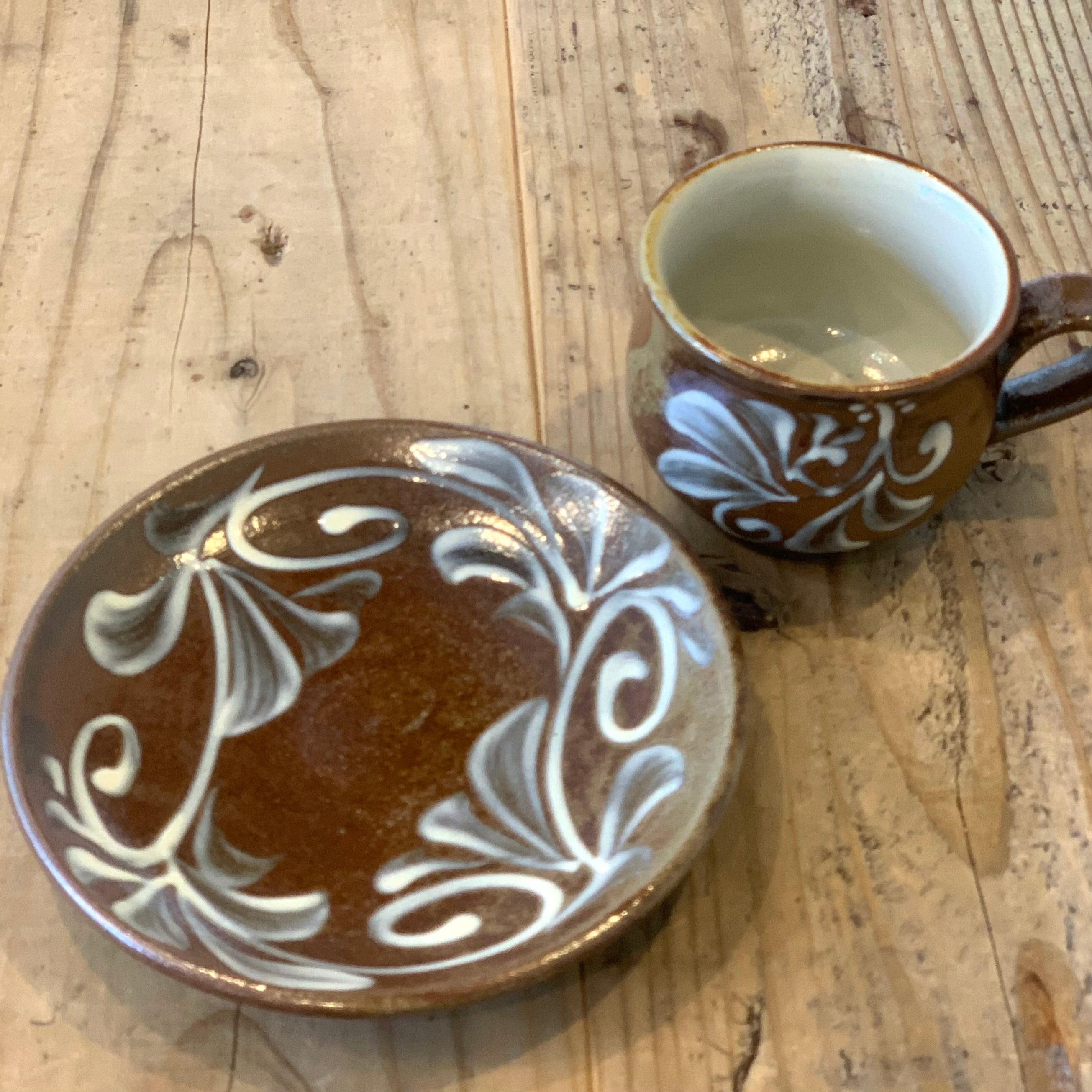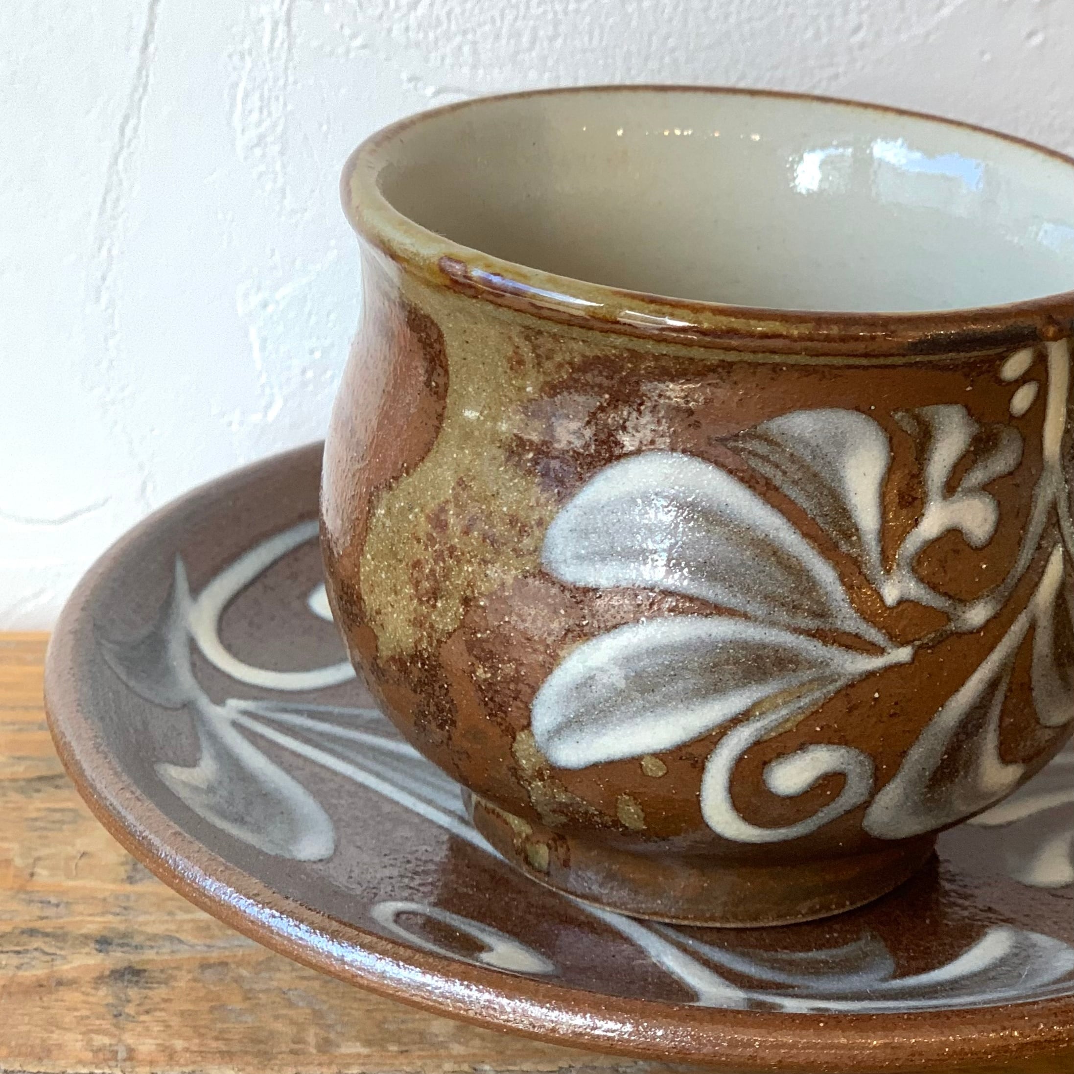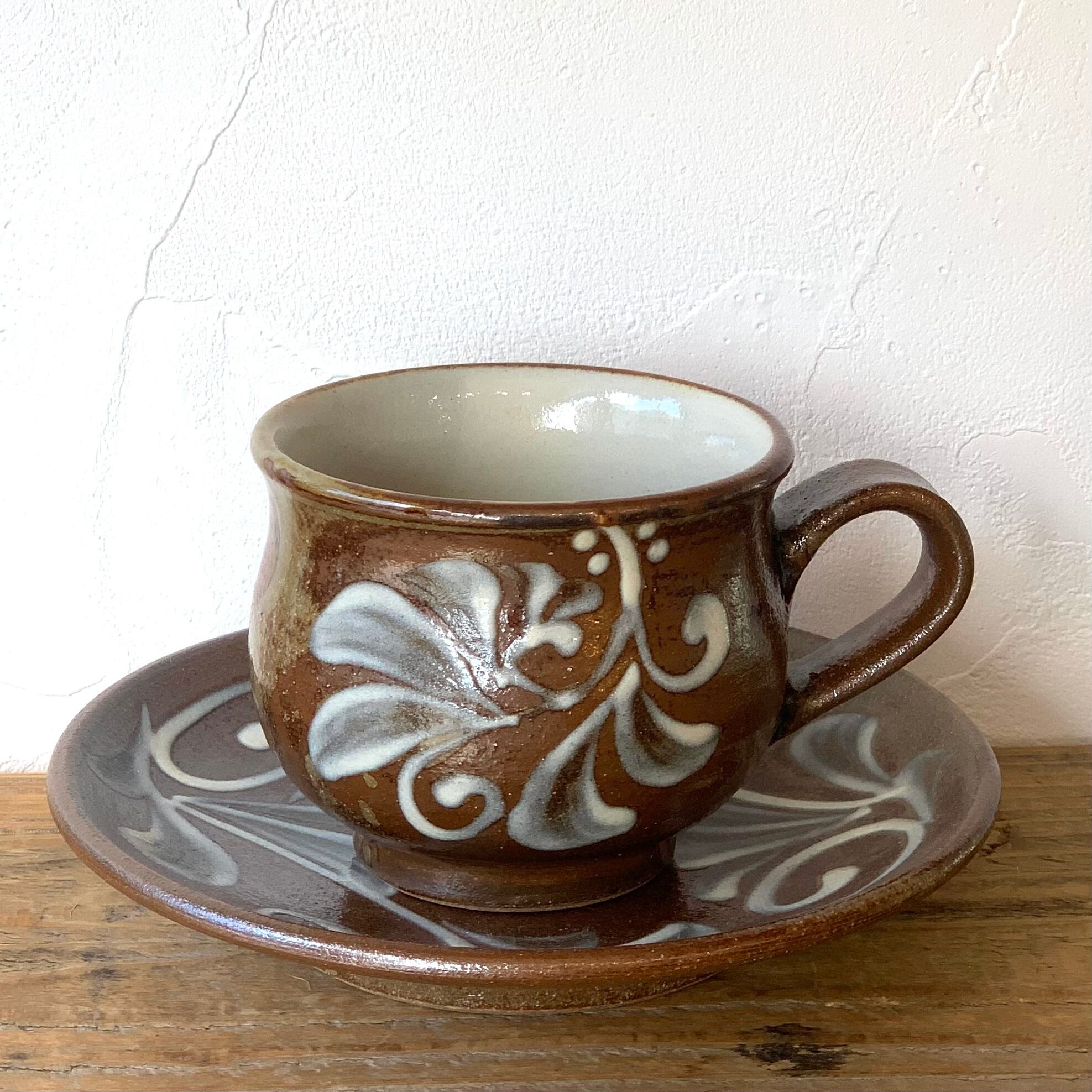 いっちん描きで表現された立体感のある模様に勢いと濃淡が加わり、思わず目を留めてしまう壺屋焼のカップ&ソーサー。