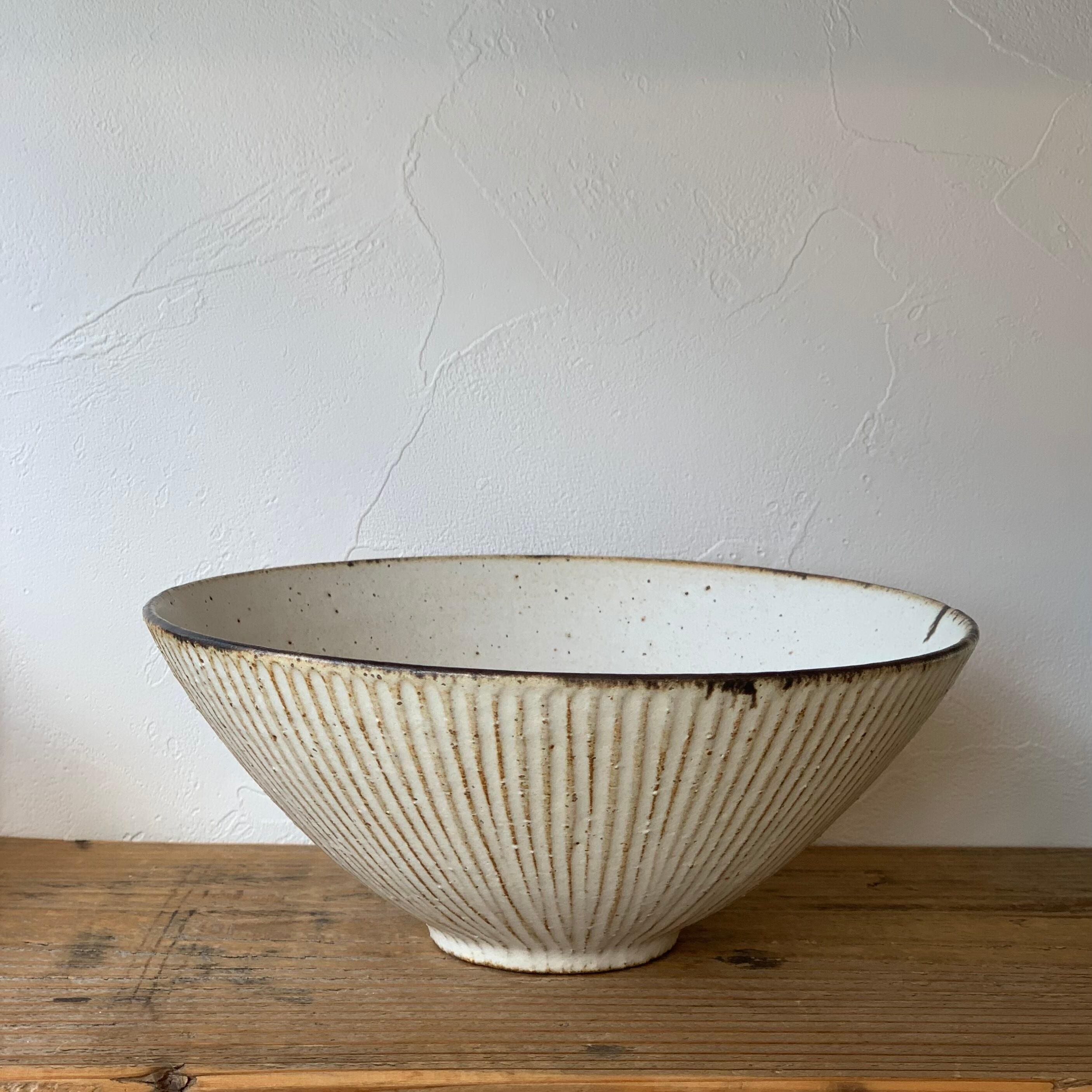 表情豊かな白で食材を引き立て、現代の食卓に調和するカラーリングに仕上げています。また、丁寧に削られた鎬(しのぎ)、底面の低めの高台(こうだい)、狭めでありながら安定感が有る深めである程度角度がついたシェイプ、幅広の縁が無いカジュアルでありながらスタイリッシュなデザイン、どれをとっても『ハイレベルなドンブリ』です。